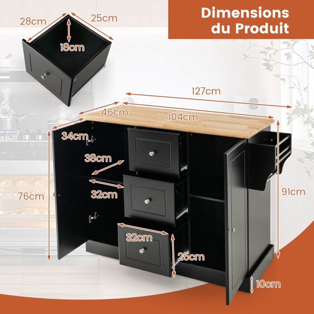 1 rubber wood countertop, 2 enclosed cabinets and 3 deep drawers for ample storage space