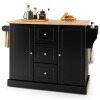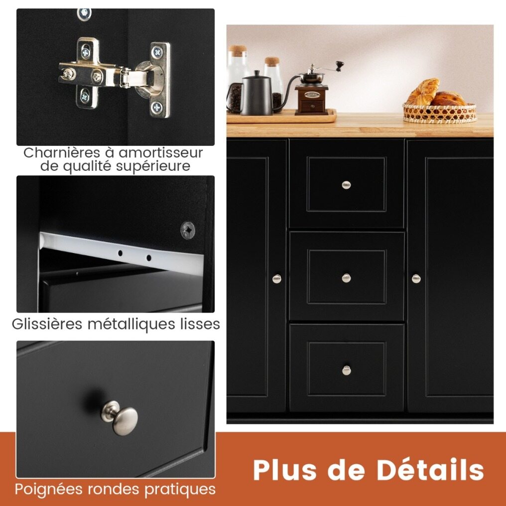 Our large kitchen island cart will be your ideal kitchen helper for food preparing and serving. It's designed with 1 rubber wood countertop, 1 multi-purpose spice rack, 1 side towel bar, 2 enclosed cabinets with adjustable shelves and 3 deep drawers for enough storage space. Besides, you can freely adjust the 5-level shelf behind the door to keep different-sized items well organized. Different from others with normal appearance and hard-to-move design, our kitchen island cart features an attractive kitchen island look and 5 easy-to-move casters. Superior soft close hinges are also better than ordinary hinges seen in the other product. What's more, this kitchen island has metal slide rails and exquisite door knobs for convenient opening or closing of the door or drawer.