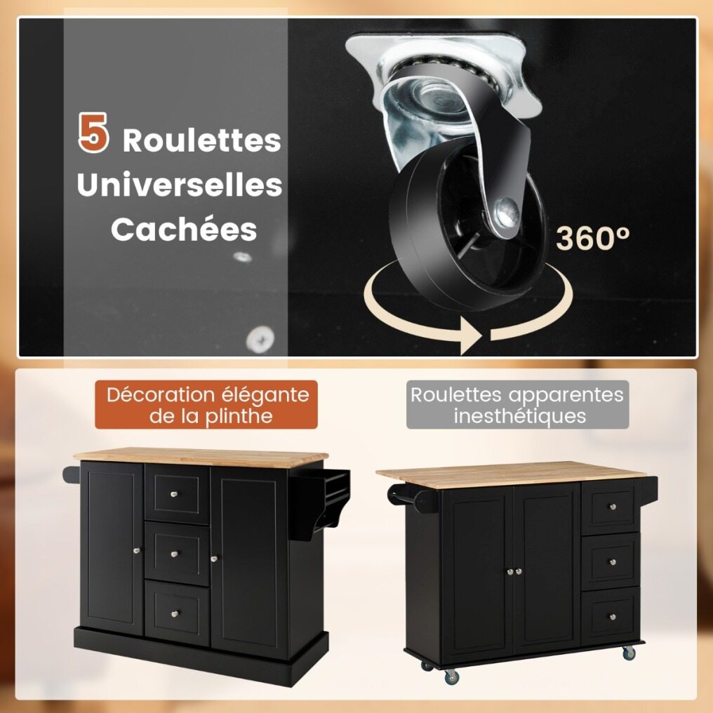 5 hidden rolling casters make this kitchen island easy to move