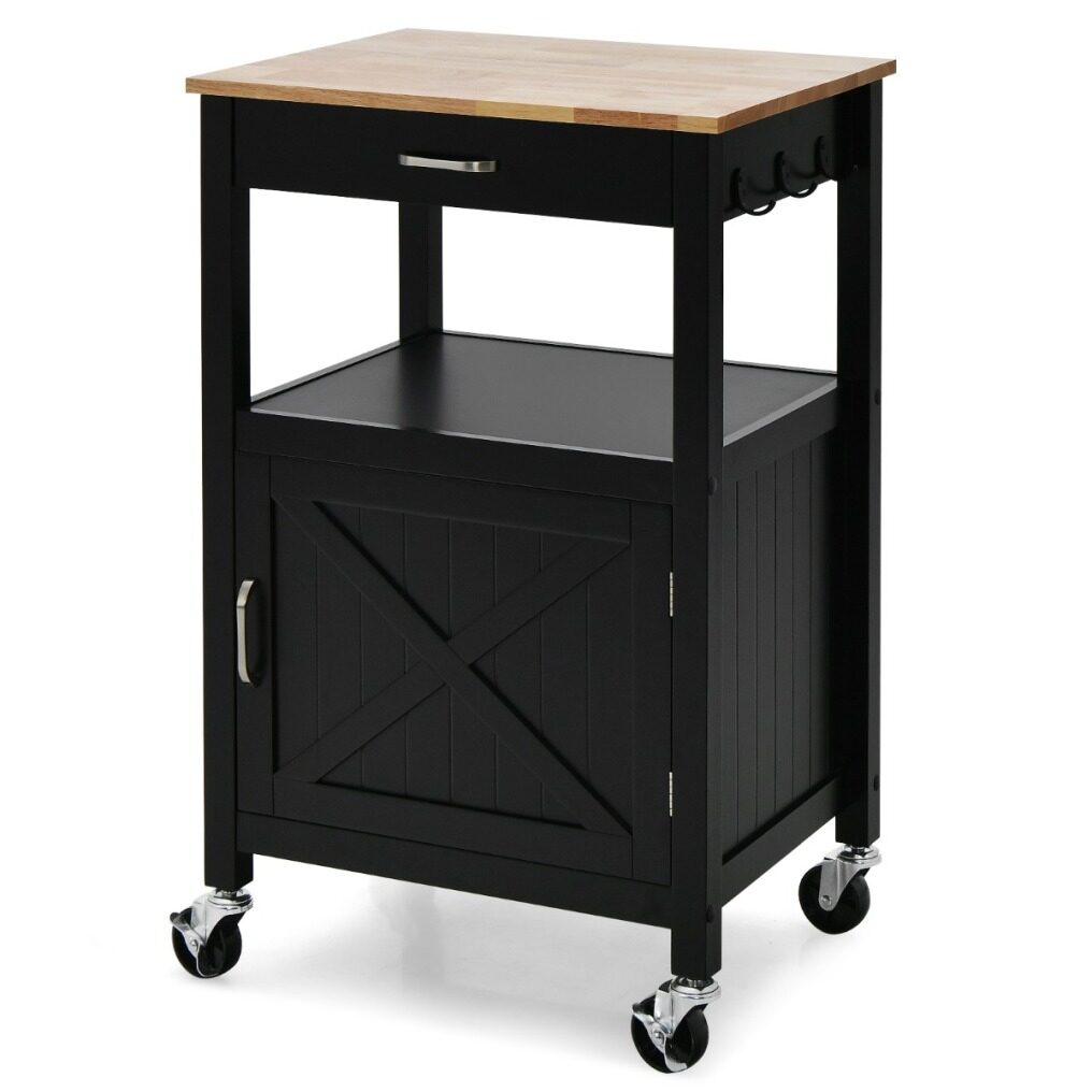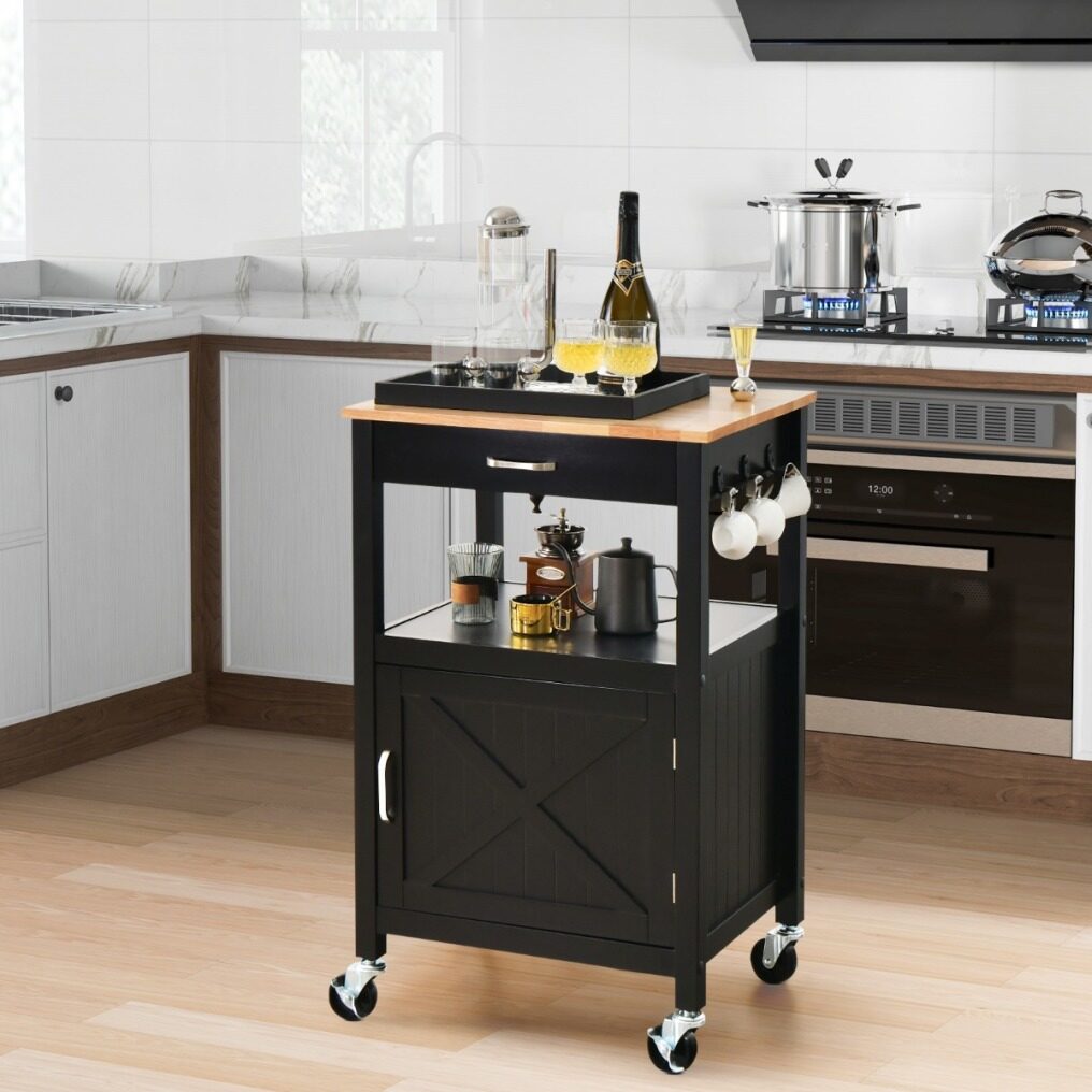 Add extra storage to your home with this rolling kitchen storage island cart! This kitchen cart features a smooth countertop, a drawer, an open shelf, a cabinet and side hooks. These ample storage spaces enable you to organize and store kitchen utensils, spices, tableware, towels, and more. The rubber wood countertop is sturdy and without burrs. The drawer with smooth drawer slides makes it easy to open and close. With handles and a magnetic catch, this storage cart is easy to use. Designed with universal wheels and a lockable design, this rolling kitchen island can wheel around smoothly and keep still when needed. It is a great addition to your home, serving as a kitchen island cart, a coffee bar, a serving cart, etc.