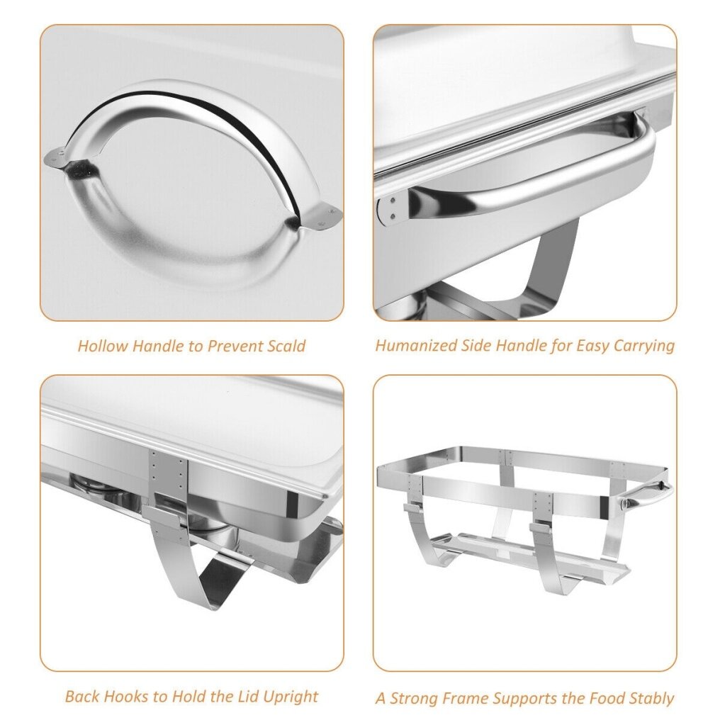 This chafing dish is crafted of stainless steel that has hard texture with good heat resistance. Food pans size are large enough for placing different kinds of food to give you diverse choices. External stainless steel handles provide convenience for your daily carrying and moving. Most importantly, each stainless steel dining chafer has two heating boxes, which can provide heat for food and keep it warm.