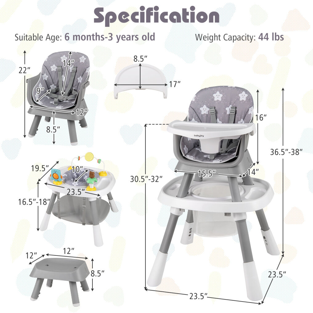 This high chair offers multiple configurations including a high stool, baby floor chair, kids chair, toddler booster, and more, providing long-term usability. Built with a stable structure and safety features, it ensures your child's safety. The adjustable tray and height settings cater to different growth stages. This highchair is easy to maintain with a waterproof seat cushion and dishwasher-safe tray. With a tool-free self-locking design, assembly and transition between configurations are effortless, making it an ideal choice for growing families.