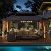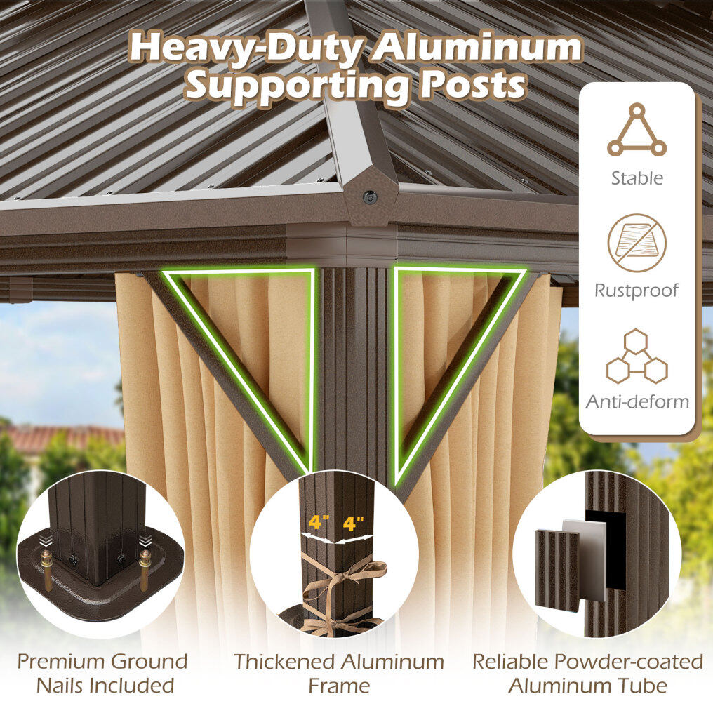 ● Heavy-Duty Structure: The top of this patio gazebo is crafted from anti-deform metal plates, while the columns and beams are made of rustproof aluminum, ensuring a long-lasting stable structure. Plus, each leg has 4 ground nails for extra stability.