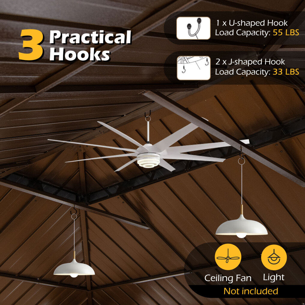 ● Convenient Roof Hook: The gazebo's roof is equipped with hooks that allow for easy hanging of various items. A U-shaped hook (55 lbs load capacity) in the center can support a ceiling fan with lights (not included), while 2 J-shaped hooks(33 lbs load capacity) on the sides are perfect for smaller lamps (not included).
