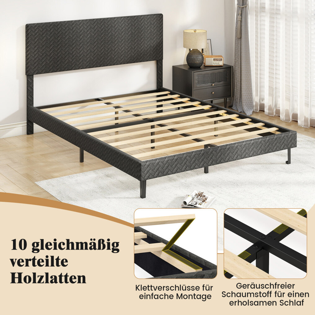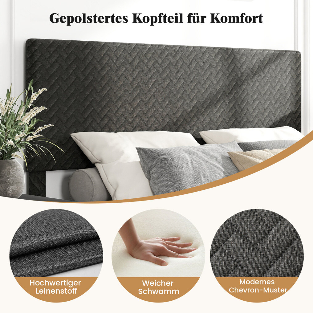 The headboard offers three adjustable heights to accommodate different mattress thicknesses. Upholstered in soft velvet/linen fabric and filled with high-density foam, this platform bed provides optimal comfort and relaxation. The elegant chevron design adds a modern and stylish touch to your bedroom. Constructed with durable wooden slats and reinforced by central metal legs, the bed frame provides a solid base for your mattress. The 16 cm clearance under the bed allows for easy access and creates more space in the room. Overall, this bed perfectly combines comfort, style, and functionality.