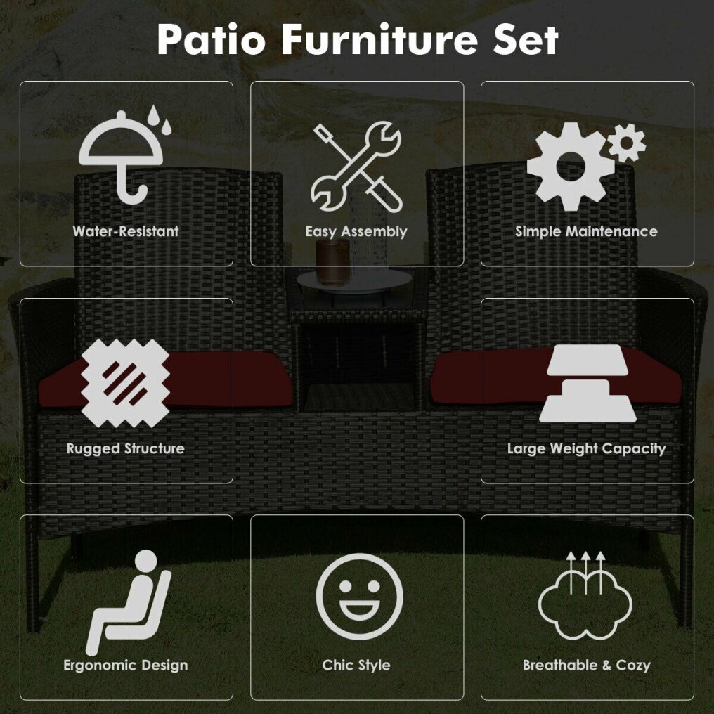 Enjoy outdoor leisure time with this patio conversation set. Featuring rugged structure and high-quality PE rattan, this patio furniture set is built to stand up to harsh weather conditions and great for outdoor using.