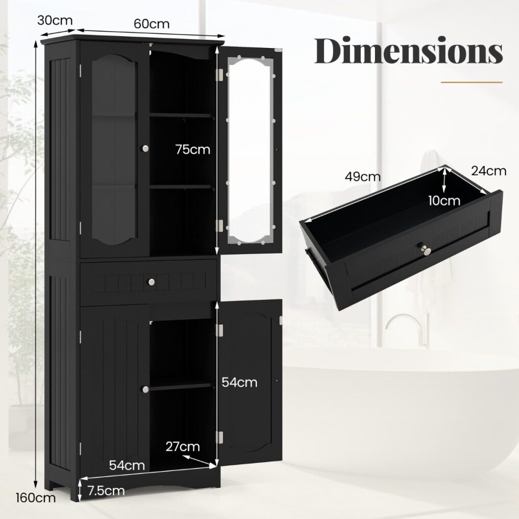 Transparent Glass Doors: This tall cabinet featuring 2 tempered glass doors can enhance your bathroom decoration. It offers a touch of elegance and privacy, making it ideal for storing toiletries, towels, and other essentials while keeping them neatly out of sight.