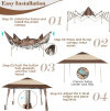 ● Simple Setup and Folding: As a quick sun-coverage solution, the patio gazebo features a clever one-button design. It only requires 2 people to pull the frame outwards and one person to push the central hub with one hand. Then set a desired overall height among 8.7/9/9.3ft. More, the gazebo also comes with a release button that unlocks and retracts the frame with a slight press, allowing for easy folding.