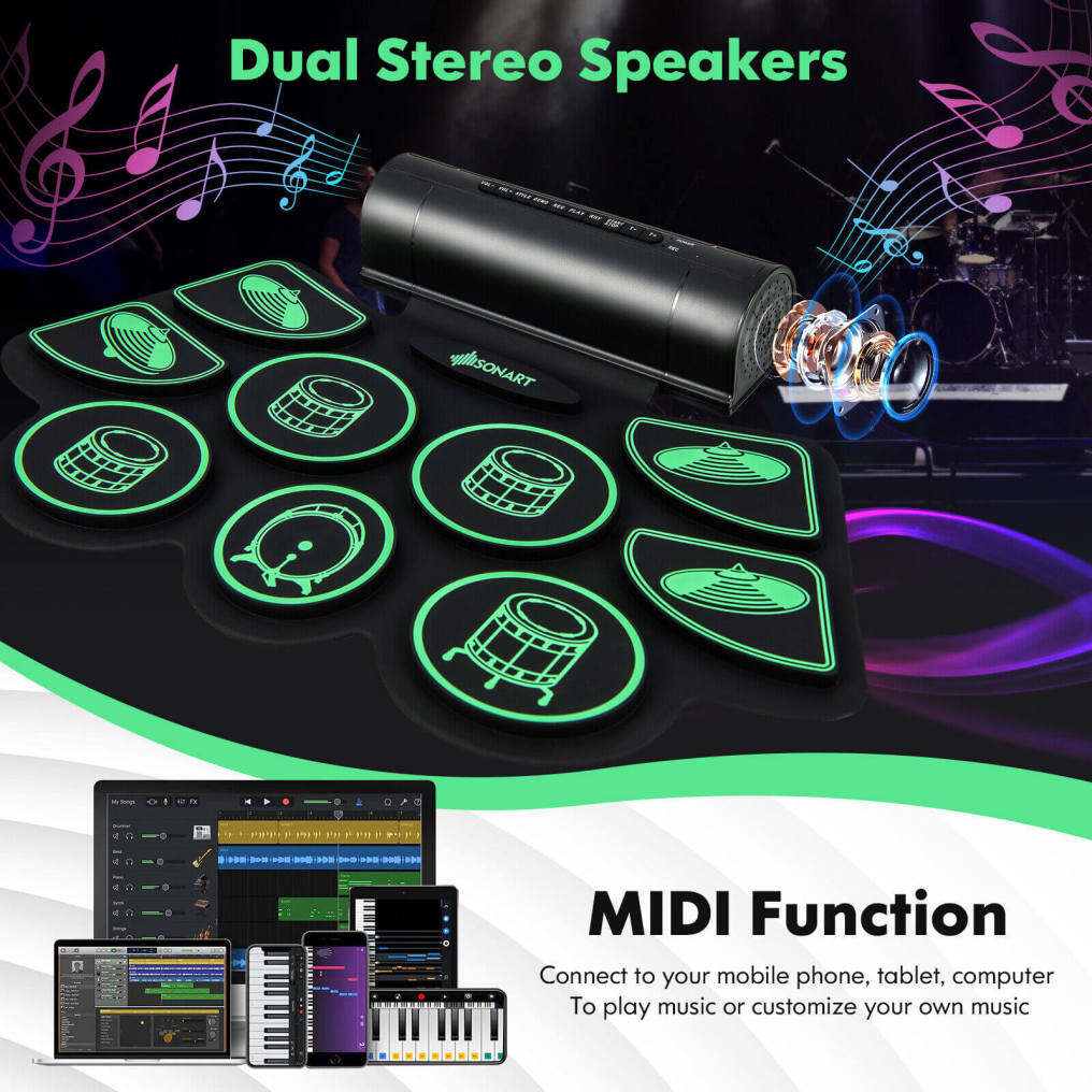 ● MIDI Connection and Games: With USB port and MIDI connection, you can connect the roll up practice pad with phone, computer or MP3 to produce music or play games. Apart from that, it can also be connected with your earphone, allowing you to play it without disturbing others.