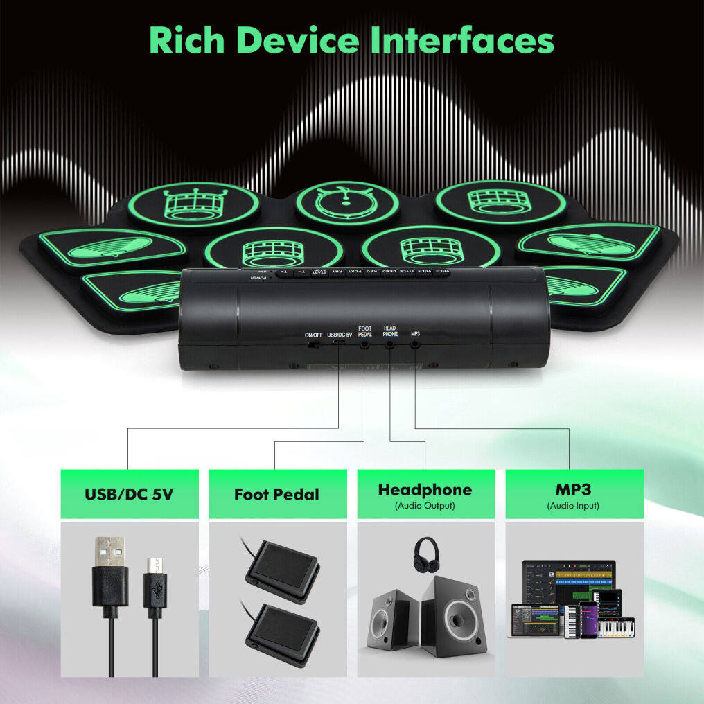 ● Ideal Gift for Kids and Friends: The electric drum kit is an ideal festival or birthday gift for kids or friends. It has 2 drum pedals for different uses. Multiple sound effects offer endless musical fun. It also helps to promote music enlightenment, brain development and hand-eye coordination. Additionally, superior silicone material makes it safe for you and your family to play.