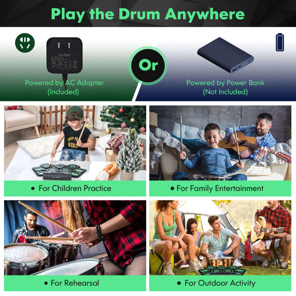 ● Lightweight and Portable Design: With narrow shape and light weight, this drum set is easy to roll and carry, enabling you to enjoy music wherever you like. Its soft materials make it easy to fold into compact size, which won’t occupy too much space in your bag and is suitable for family entertainment, friends gathering or school performance.