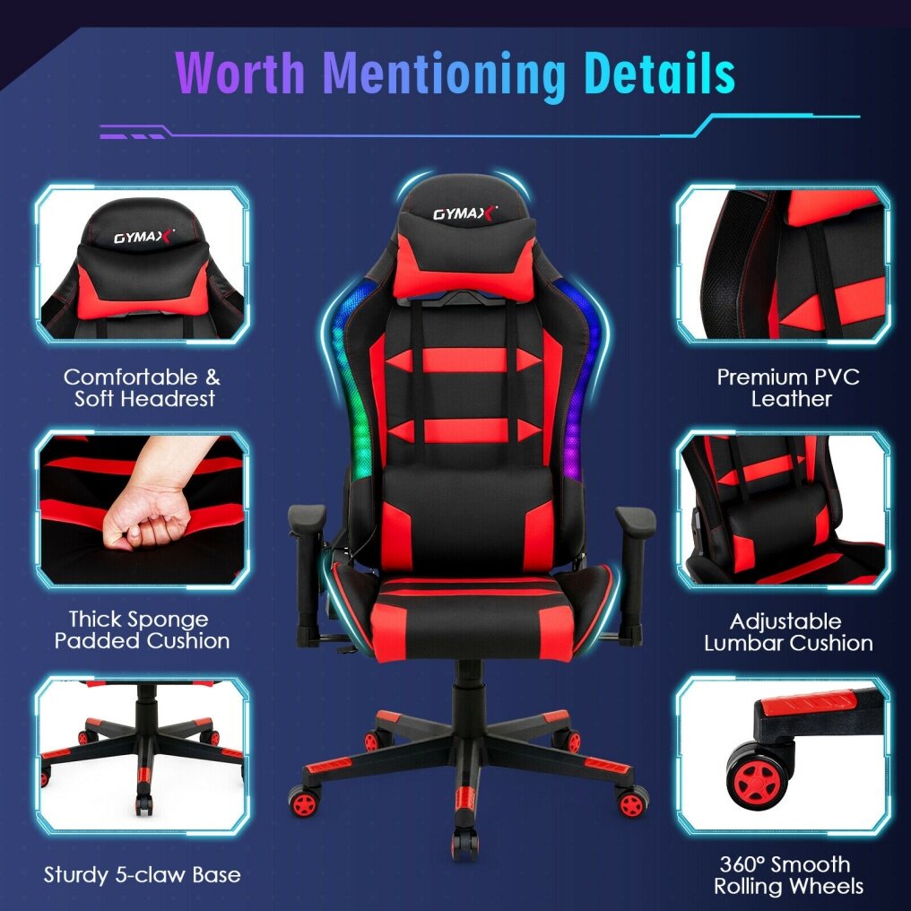 ● Stylish Design with Flashing LED Lights: The bright RGB LED lights on the edge of the chair back create a more exciting gaming atmosphere. Light mode, brightness, light color can be easily switched by the included remote controller. Combining stylish appearance and practicability, this gaming chair is a perfect addition to your home or office.