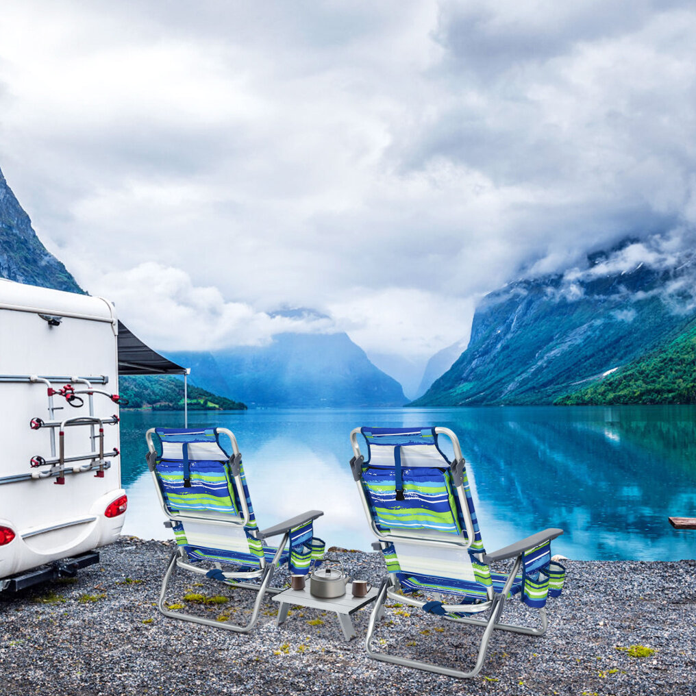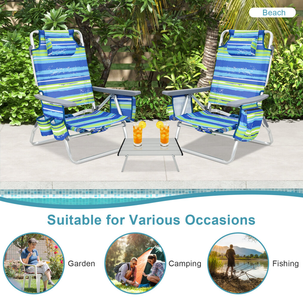 Beach Chairs & Table Set: This outdoor chair set includes 2 beach chairs and a side table, which is a great choice for you to spend leisure time with family or friends. In addition, this beach chair and table set is ideal for outdoor activities, such as fishing, camping and so on. 5-position