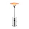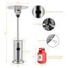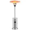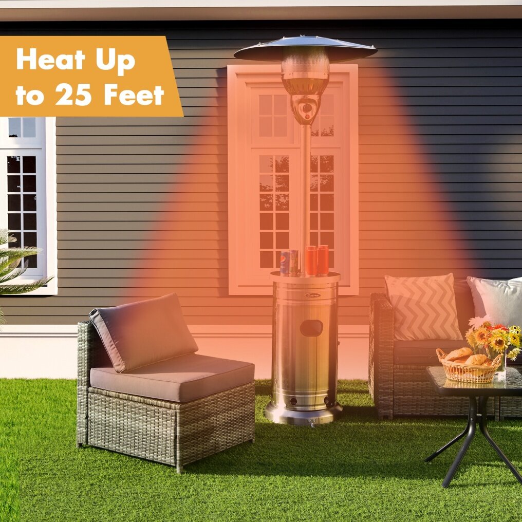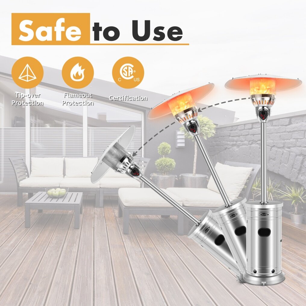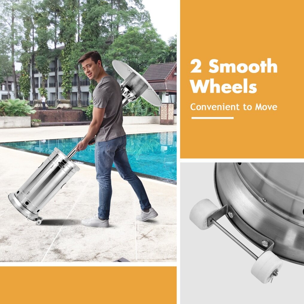 With 48000 BTU output, heat-focusing reflective cover and flame emitter, this outdoor heater produces steady and comfortable warmth and heats up to 25 feet. Likewise, the simple ignition system and convenient drink shelf table make this patio heater easy to operate and humanized to fetch beverages. Apart from these, safety is very important. Hence, the tip-over protection and flameout protection ensures you and others' safety. What's more, this standing heater features premium stainless steel, base reservoir and ground fixers so that it can stay outdoors firmly. When out of use, there are 2 smooth wheels for you to push this outdoor heater easily.
