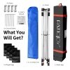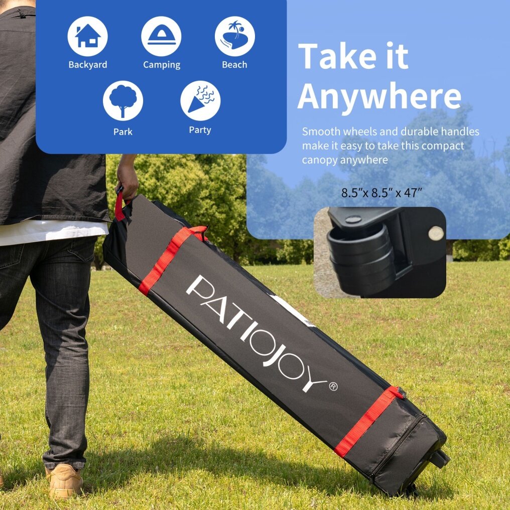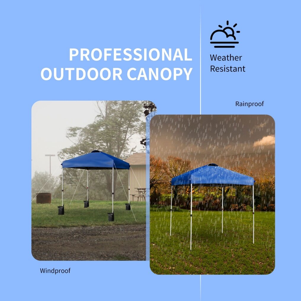 This commercial canopy tent offers you up to 6.6' x 6.6' shade, which is big enough to cover one table and several chairs. It also provides 3-level height adjustment to satisfy various requirements. The canopy top is wear-resistant and rainproof to support long time outdoor use. With the heavy-duty steel frame, the sun shelter is stable to stand in wind or rain. Use extra ground stakes, tie-down ropes and weight bags to further enhance its stability. All canopy parts are collapsible or detachable to be organized in the roller bag. This portable bag is not only for easy carrying, but also for convenient storage.