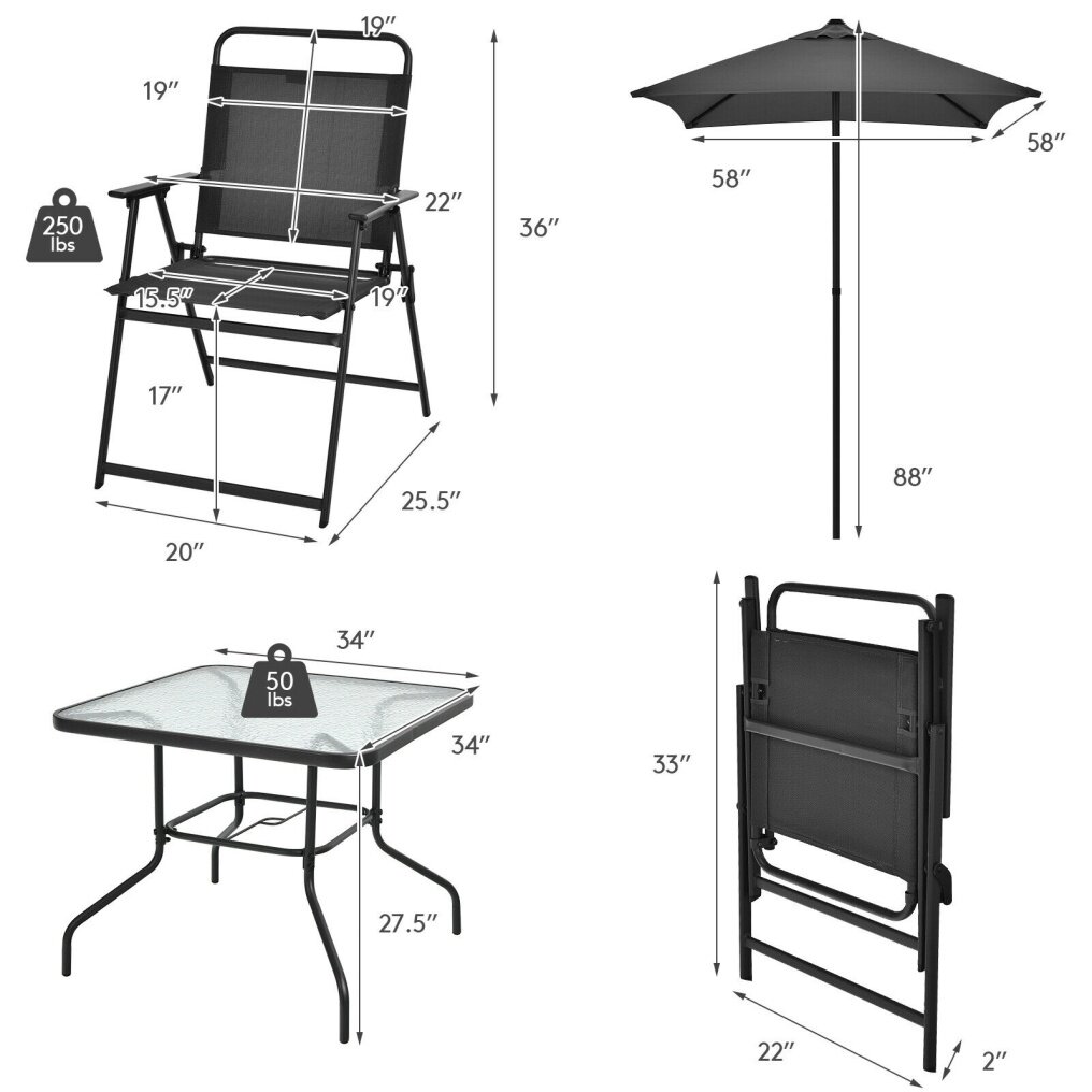 ● About Dimension: Dimension of umbrella: 58" x 58" x 88" (L x W x H), dimension of table: 34" x 34" x 27.5" (L x W x H), unfolding dimension of each chair: 25.5" x 20" x 36" (L x W x H), folding dimension of each chair: 33" x 22" x 2" (L x W x H), seat height from the ground: 17" , weight capacity of table: 50 lbs, weight capacity of each chair: 250 lbs.