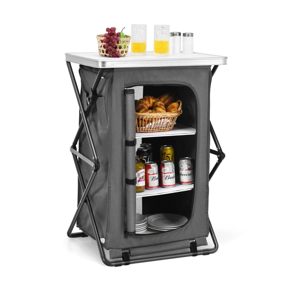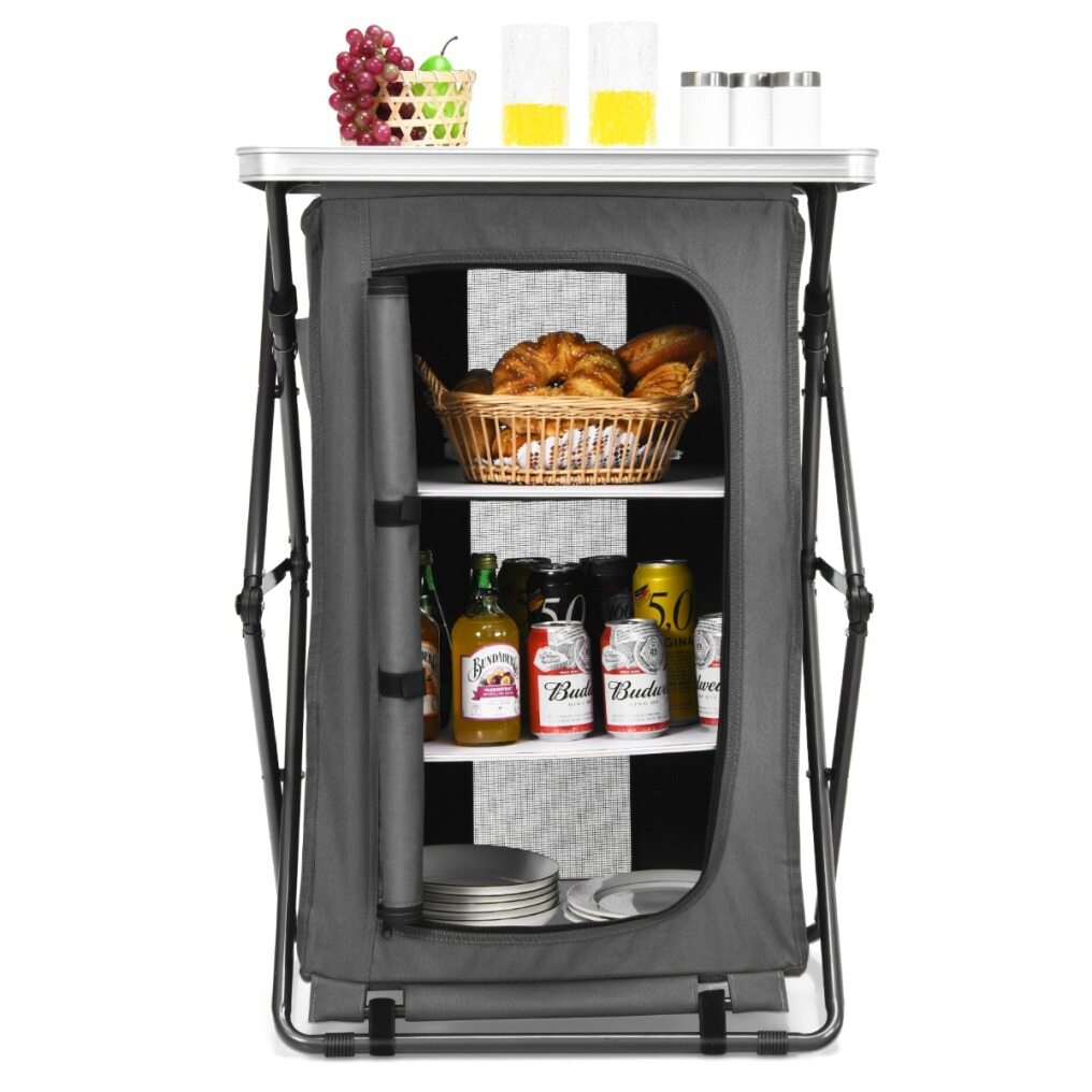 Our folding storage cabinet is a perfect collocation for indoor and outdoor activities like camping, picnic, barbecue, party and more. Supported by the heavy-duty steel frame, it ensures a rugged and stable structure for long service life. Waterproof oxford cloth and breathable mesh make it more suitable for outdoor use. It also features 3 inner shelves to meet your multiple demands while a spacious tabletop provides adequate space to hold items. The hasp, plastic button, hook and loop fasteners enhance overall stability. With a convenient carrying bag, it is easy to store and transport anywhere you need. Besides, you can set up the cabinet easily within several seconds and quick to fold it together. Don’t hesitate to take it home!