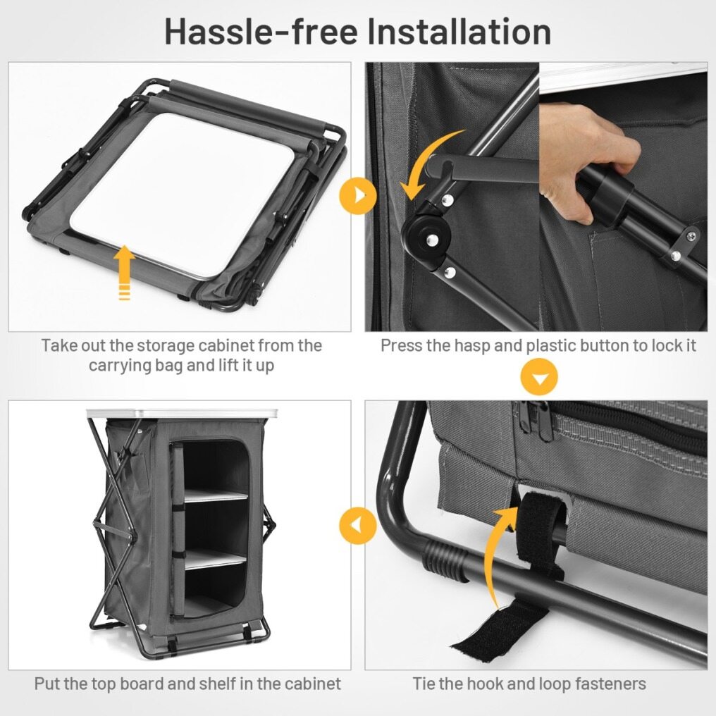 Simple Assembly & Cleaning: Easy assembly is required. Take out the storage cabinet from the carrying bag and lift it up, then press the hasp and plastic buttons to lock it, tie the hook and loop fasteners and finally put the top board and shelf in. Besides, the smooth surface only needs to be lightly wiped with a damp cloth.