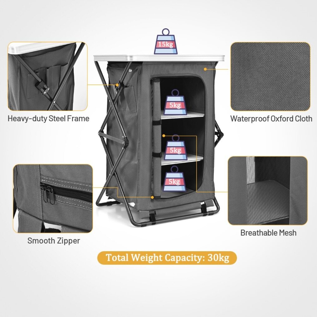 Folding & Portable Design: This camping storage cabinet can be folded into a compact size for easy storage, which can be put in the car or corner to save space. Moreover, the carrying bag brings much convenience to transport from one place to another when you need it for outdoor use.