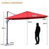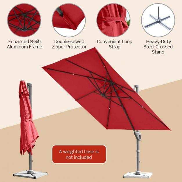 The patio umbrella is crafted with 8 durable aluminum ribs and thick aluminum pole coated with rust-resistant finish, which ensures excellent durability and long-term outdoor service life. In addition, this patio umbrella has 4-angle tilt adjustment and can be rotated 360° at will, offering all-round sun protection. And its sun-protective fabric will block up 98% harmful sun lights. A weighted base (not included) is necessary to enhance stability while using. Detailed instruction ensures quick set-up, so you can place it anywhere as needed. What’s more, the umbrella will be an eye-catching decoration in outdoor occasions.