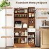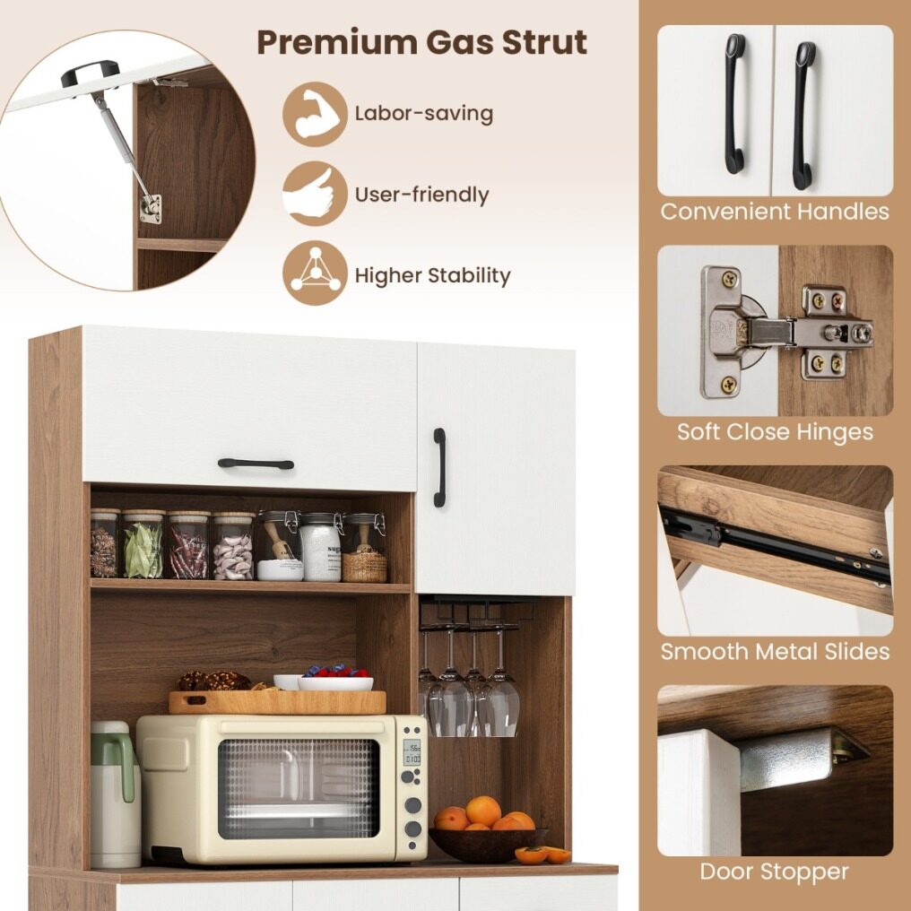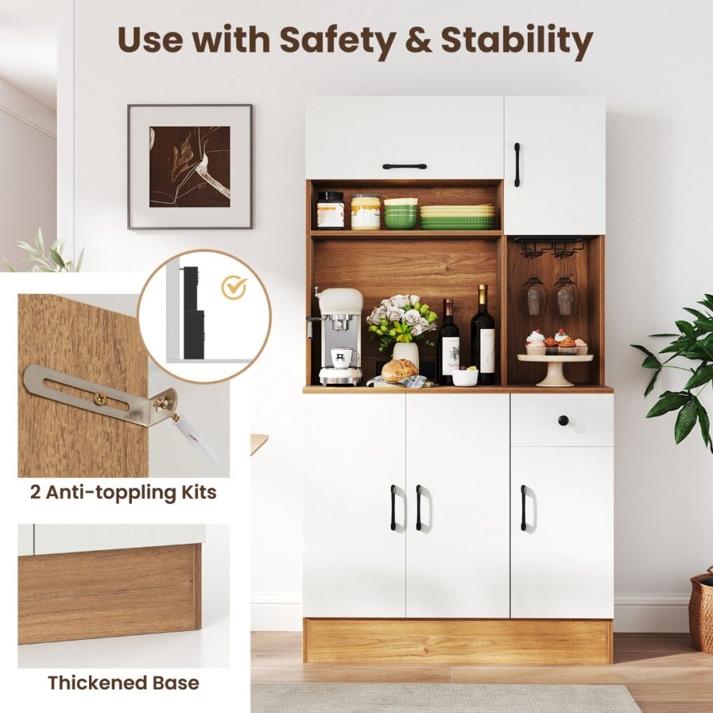 Abundant Storage Space: This pantry cabinet features a flip-up cabinet and an open shelf for easy access, paired with a wide countertop for organizing kitchen appliances. The built-in wine glass holder safely secures your stemware. Also, the convenient drawer, 2-door cabinet, and single door cabinet keep kitchenware and dinnerware organized.