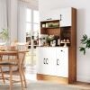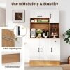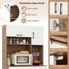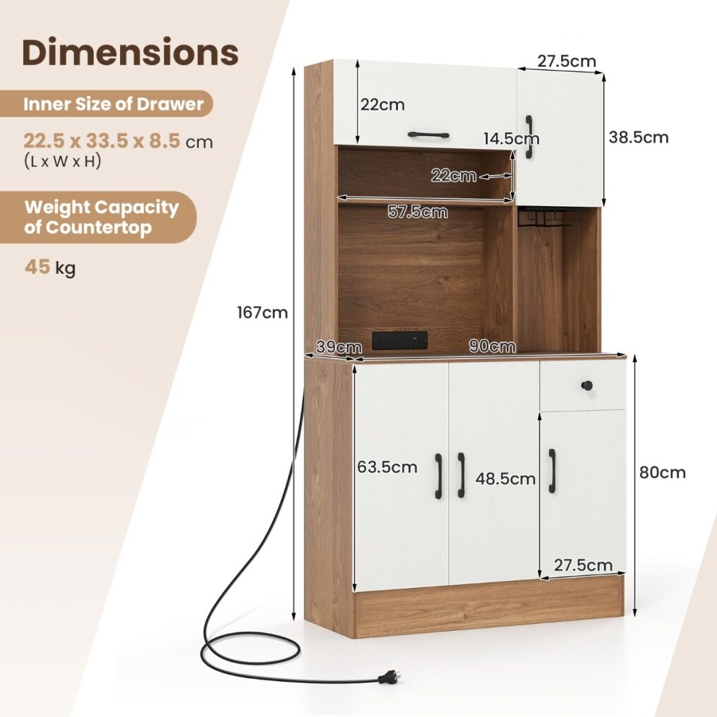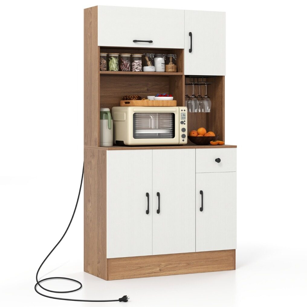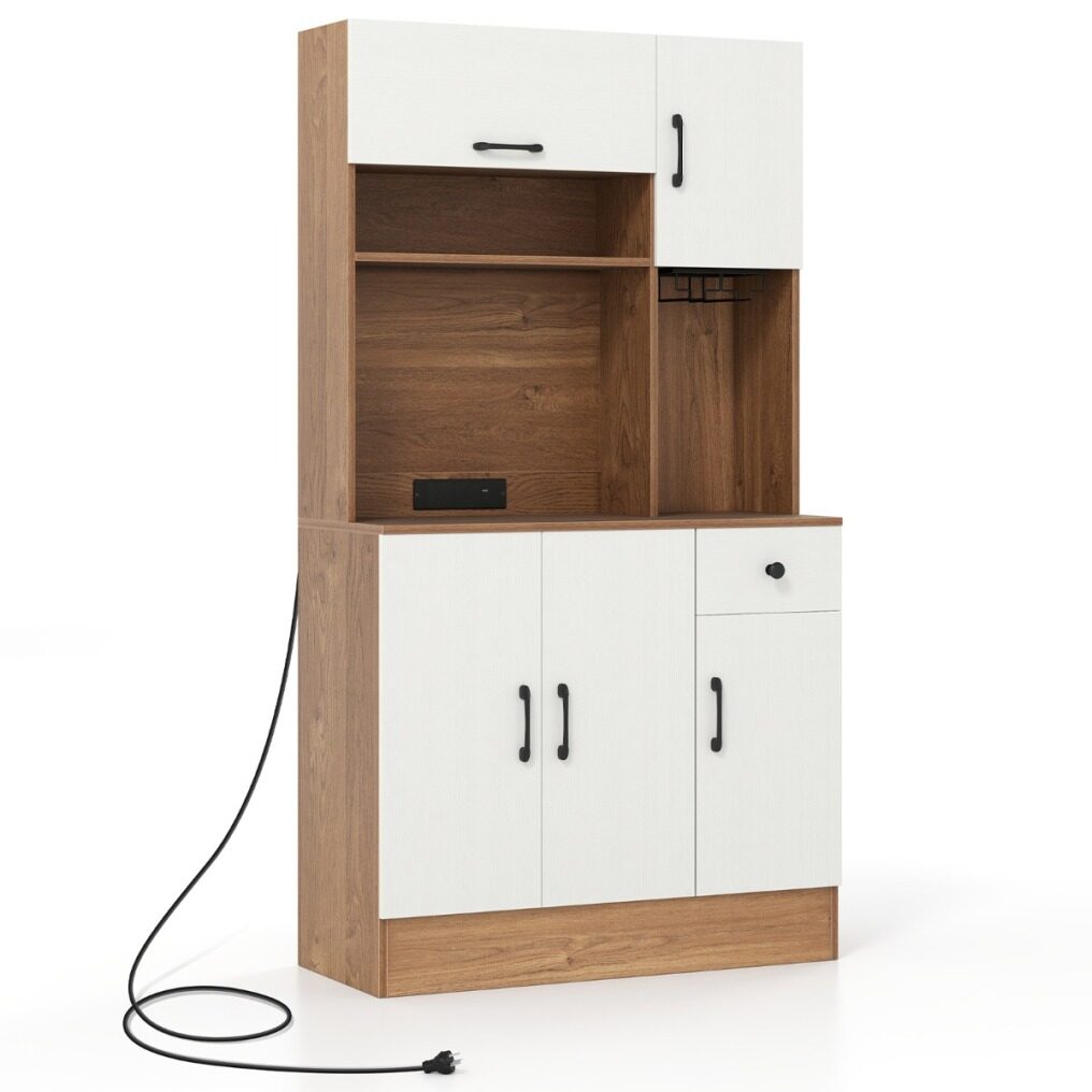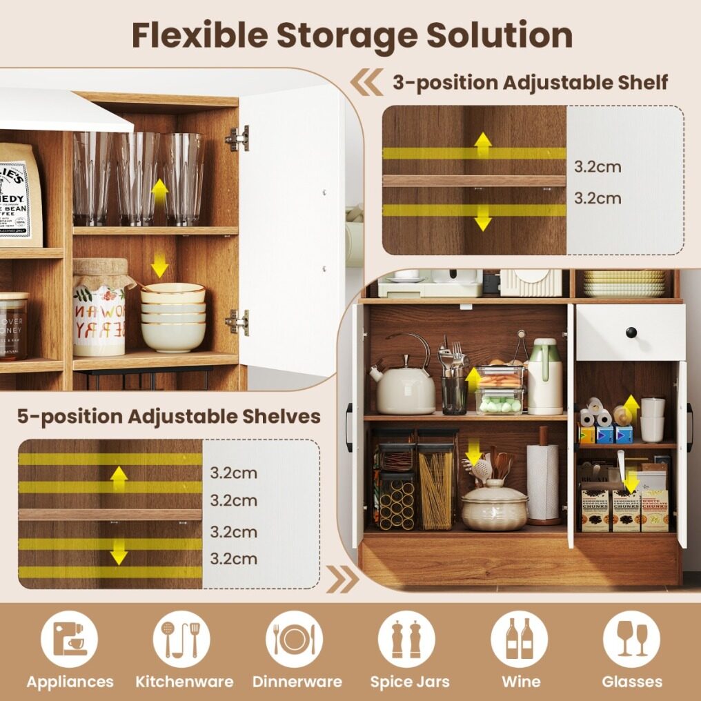 The combination of flip-up cabinet, open shelf, wide countertop, and slide-out drawer keeps your kitchen essentials neatly organized. Featuring 3 adjustable shelves in the cabinets, this piece organizes everything from kitchenware to spice jars. Together with stemware rack, the pantry cabinet is a stylish solution to keep glasses accessible. Need to charge but the nearest outlet is far away? This cupboard is equipped with charging station for added convenience. Safety is considered with the inclusion of anti-tipping kits, ensuring the cabinet remains stable and secure. This freestanding buffet cabinet is an ideal addition to your kitchen or dining room, bringing a streamlined organization in an elegant way.