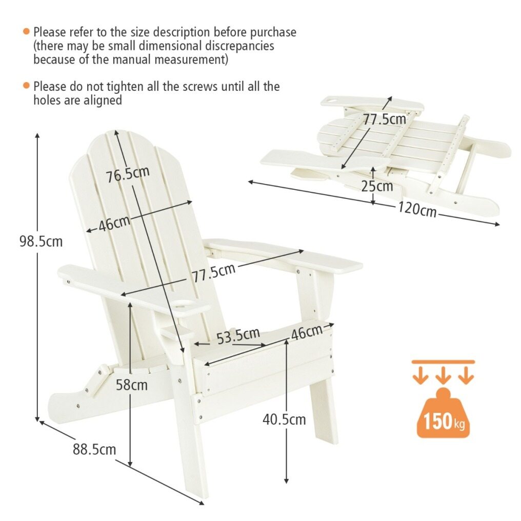 Easy Installation: All the tools and clear instructions are provided to make the assembly easier for time-saving. And you are able to paint and DIY your own Adirondack chair. Overall dimension of unfolding: 77.5x88.5x98.5cm(L x W x H), overall dimension of folding: 120 x 77.5 x 25cm (L x W x H), weight capacity:150kg.