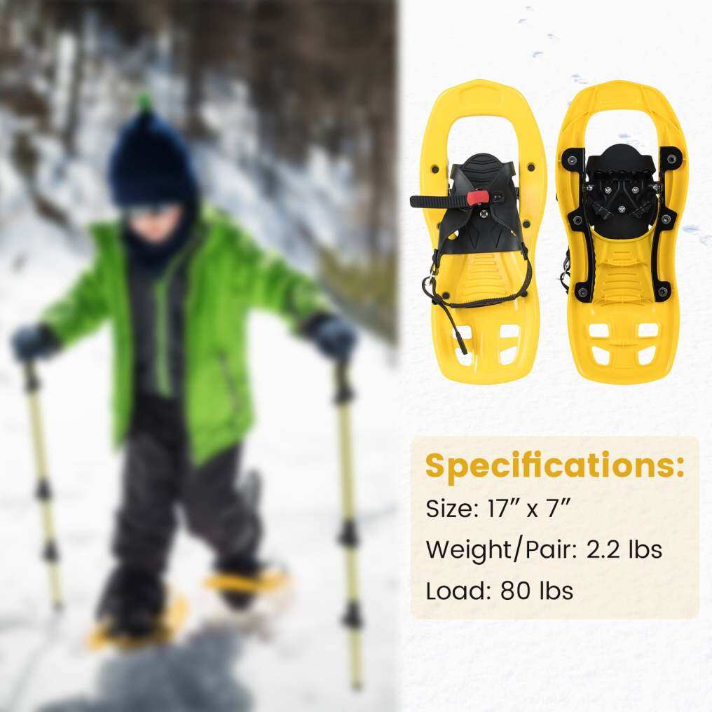 【Complete Ready-to-Use Kit】This kit includes 42 x 18 cm snowshoes, adjustable hiking poles and a convenient carrying bag for easy storage or shoulder carrying, ideal for children and young people up to 36 kg.