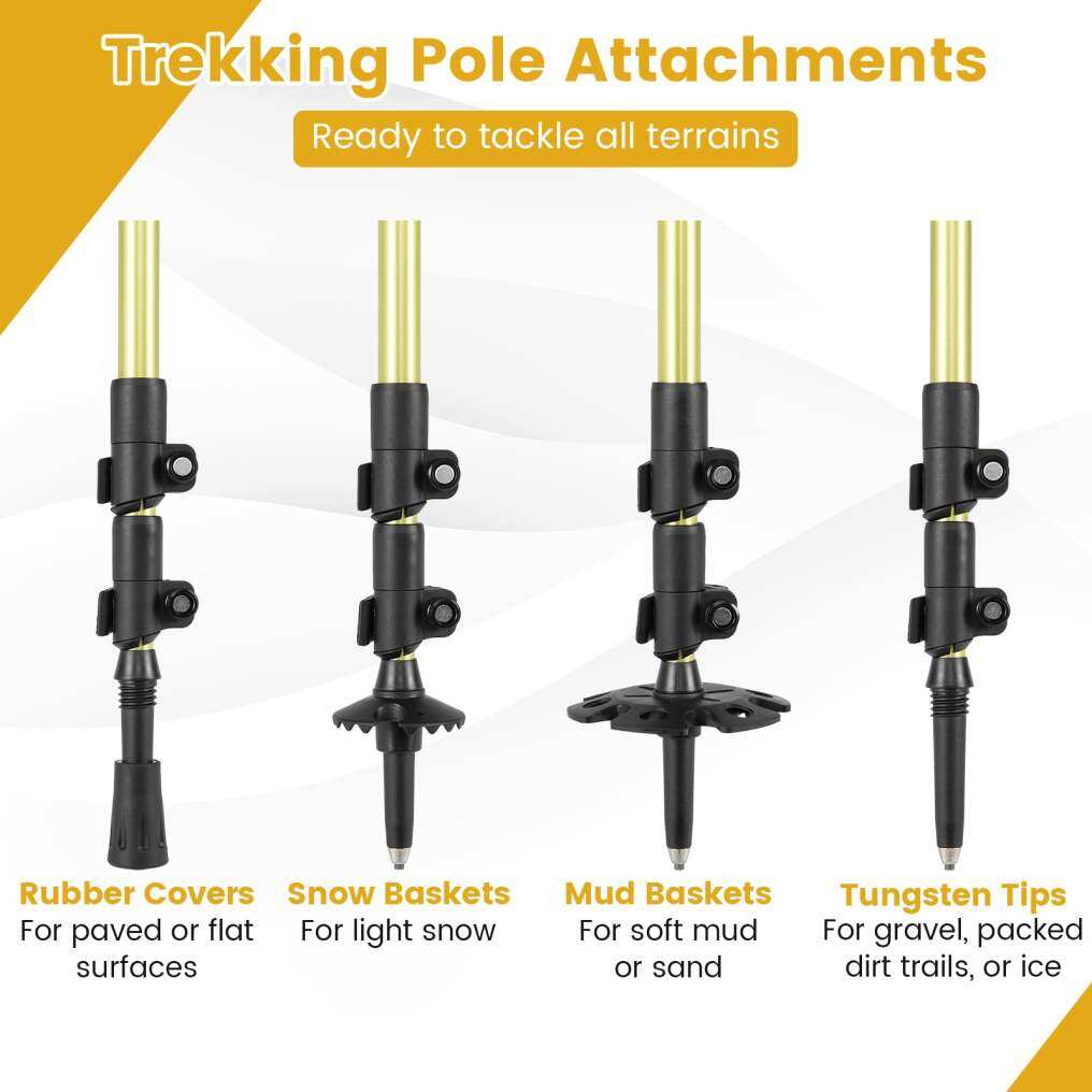 【Adjustable Trekking Poles】Includes ultra-lightweight telescopic aluminum poles adjustable from 51.5 cm to 100 cm, equipped with tungsten tips, snow baskets, anti-slip shields, mud baskets and ergonomic grips, ensuring comfort and performance without wrist fatigue.