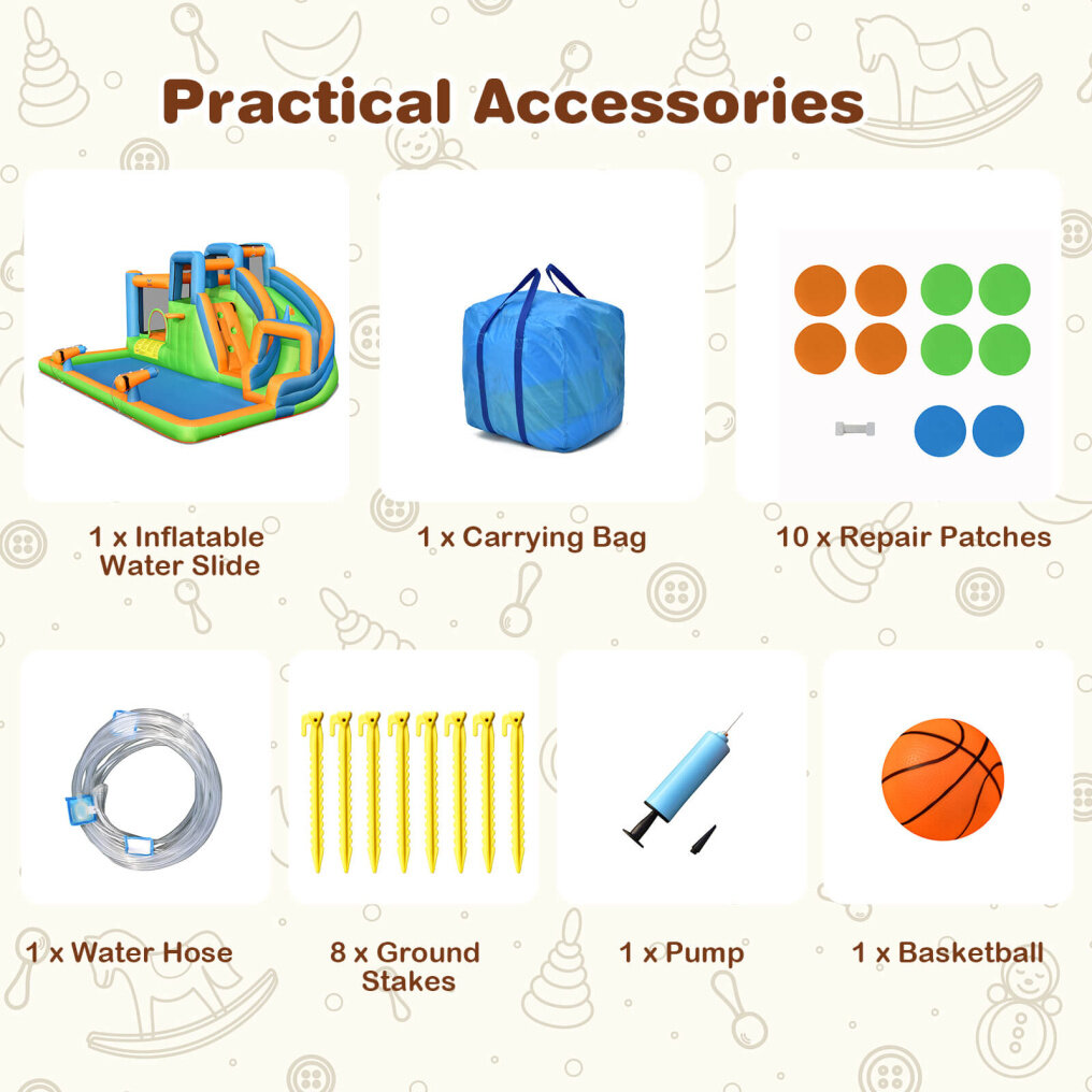 All-included Package: Comes with a convenient carrying bag, the deflated and folded waterslide is easy to carry and storage. Besides, the package also includes 8 bouncer stakes, 10 repair patches, a water hose assembly kit, an inflatable basketball and a hand pump for the ball, getting you ready for setting up the bounce castle.