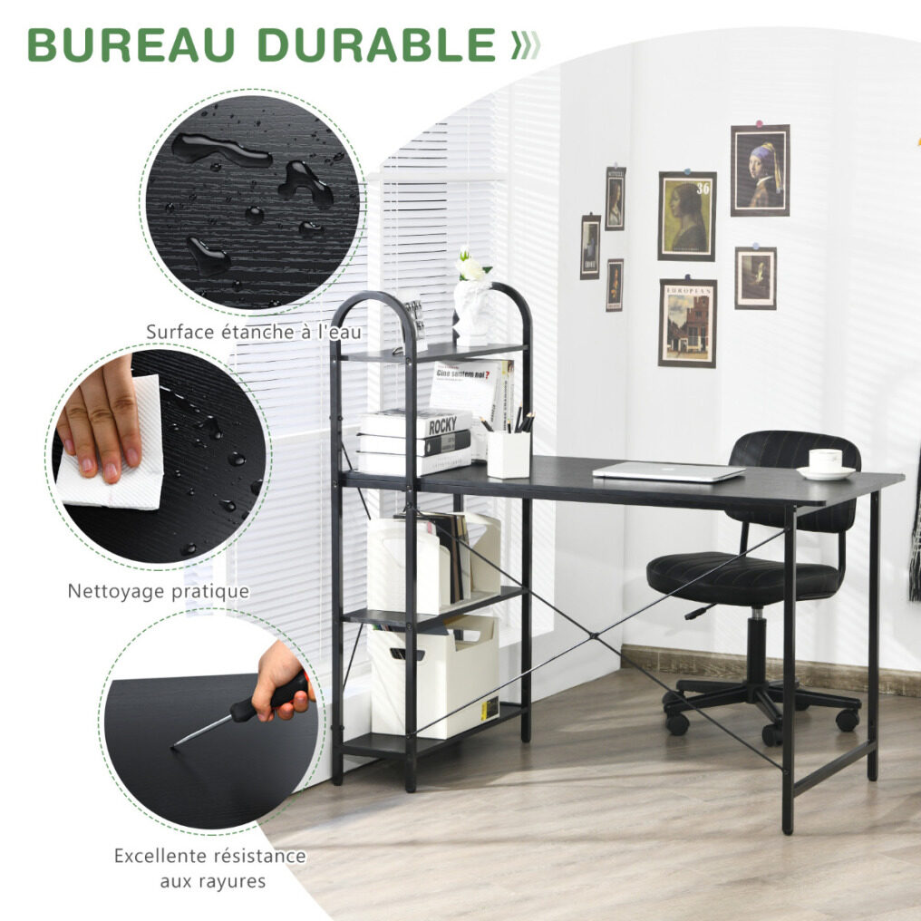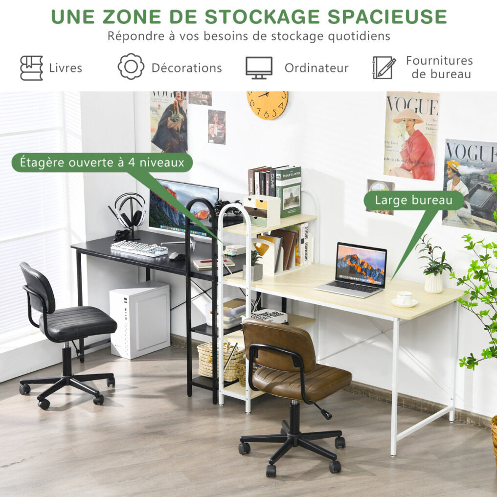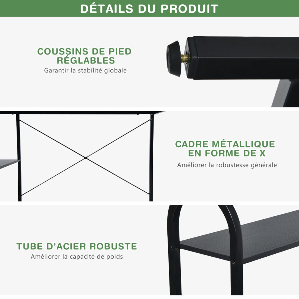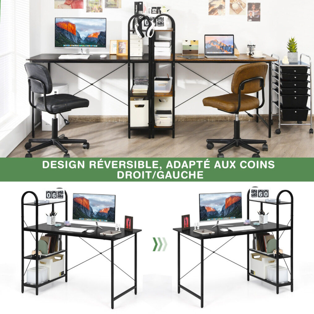 Designed with metal construction, the computer desk is excellent in sturdiness, which shows in the overall weight capacity of up to 90kg. The dimension of the desktop is 120 x 60 cm, which is spacious enough for a common computer and other items. On the side, there is a 4-tier open shelf where you can store many office supplies. As the shelf is reversible, you can freely place it in the right and left corners. Therefore, it is very suitable for small rooms.