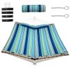 Wanna curl up for a peaceful nap on a comfortable lounger chair? Wanna lay outdoors to feel the embrace of nature? Our outdoor quilted fabric hammock with pillow will be a great addition to any outdoor living space! Constructed with selected polyester fabric, solid beech wood spreader bars and cotton ropes, the outdoor hammock for the backyard is durable and stable to offer you relaxation and comfort. Besides, the sturdy o-ring with chains is adjustable to find your optimal hanging height. Suitable for the backyard, patio, deck, or garden to let you and your family lay down, relax and have a great time!