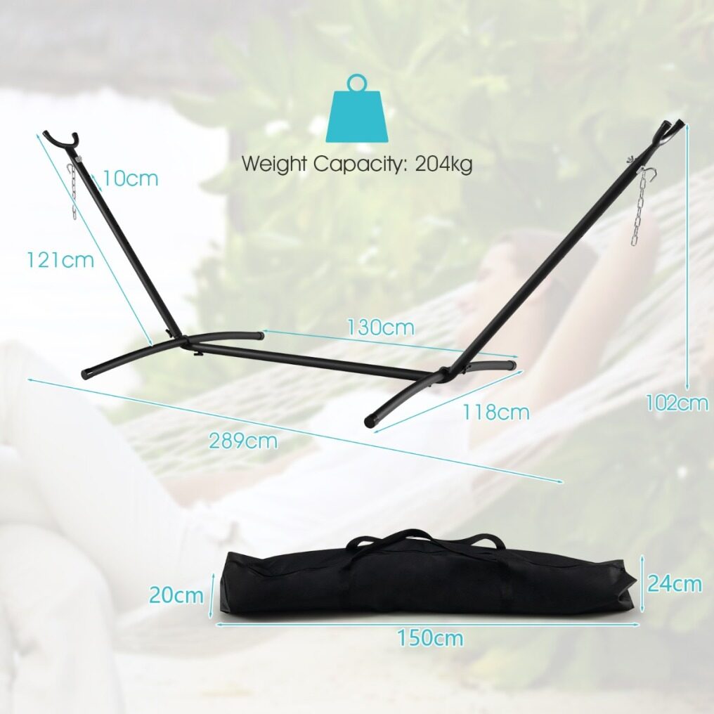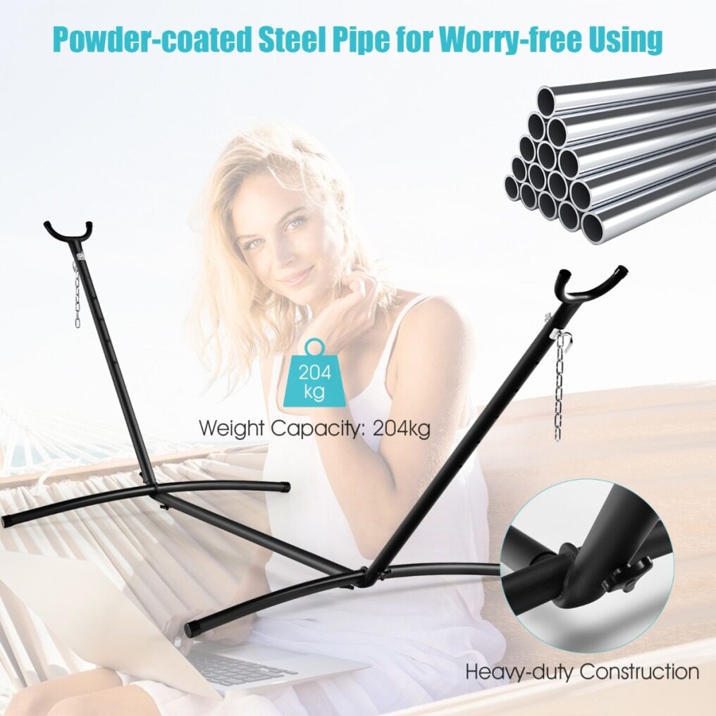 Reinforced Steel Structure: Composed of thicken steel tubes, the hammock stand features perfect sturdiness, avoiding deformation during long-term use, and great load capacity of 200kg, enabling 2 adults to sit together. Also, its surface is fully sprayed to improve rustproof performance.