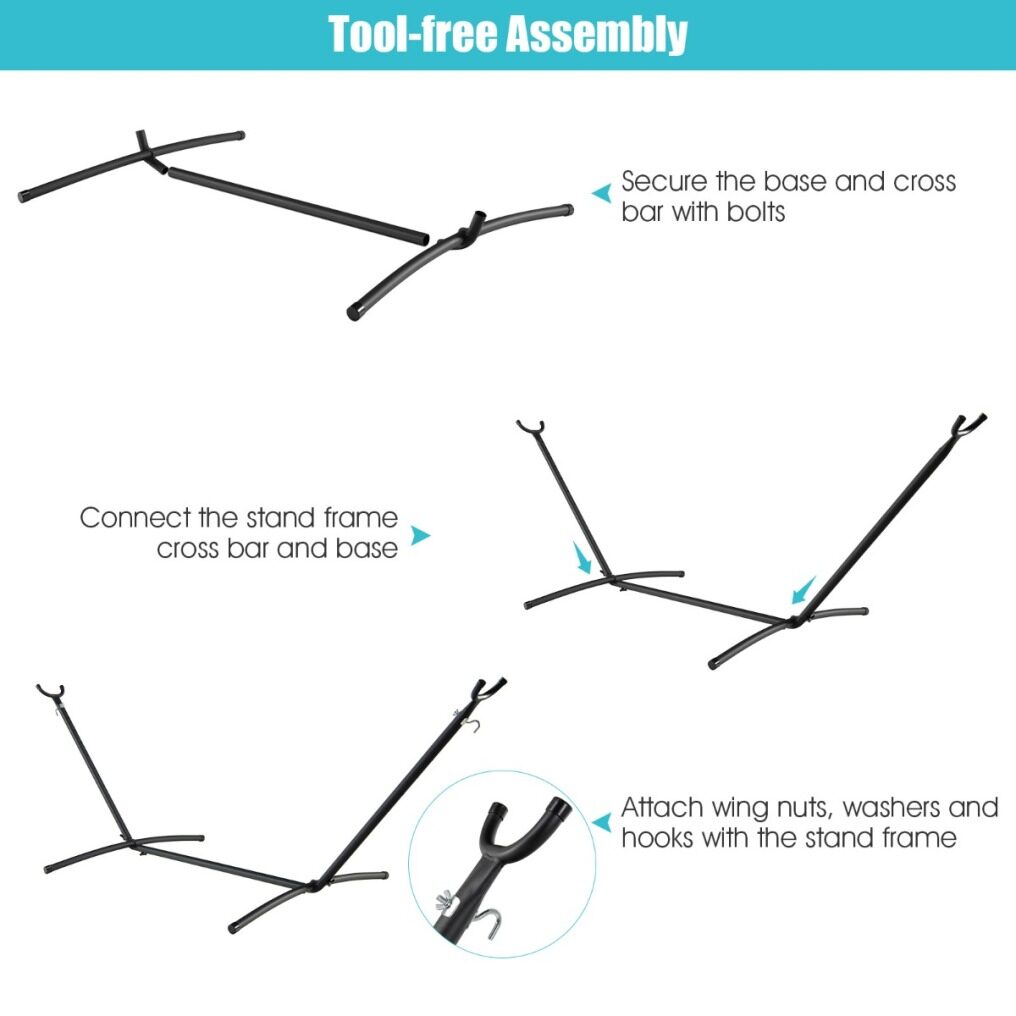 Stability for Secured Safety: Each steel tube is securely attached with reinforced screws to get rid of dangerous wobbling. More, the hammock stand is fitted with four anti-slip pads, which helps gain good balance and avoids unwanted floor scratches. In this way, a stable sleeping on this hammock stand becomes true.