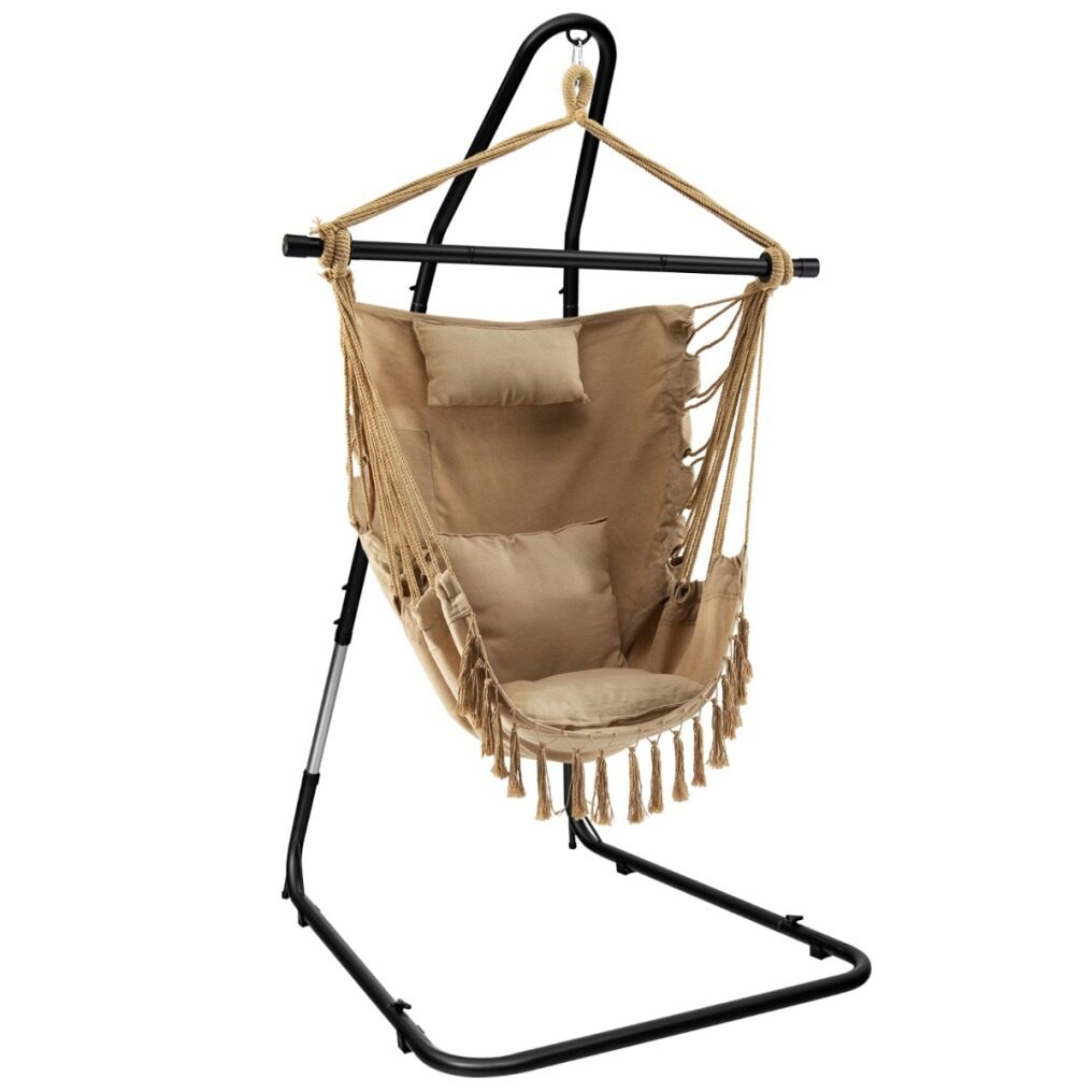 Enjoy your leisure time with this hanging rope swing chair! This comfortable hammock swing is made of durable cotton ropes and heavy-duty steel bars for long-term use. The grooved snap rings on each side of the bar ensure a safe and stable sitting experience. Besides, this hammock swing is paired with a soft pillow and 2 removable cushions for extra comfort. With elegant and stylish tassels, it will add charm to your indoor and outdoor places. The maximum weight capacity is 330 lbs. Requires easy assembly.