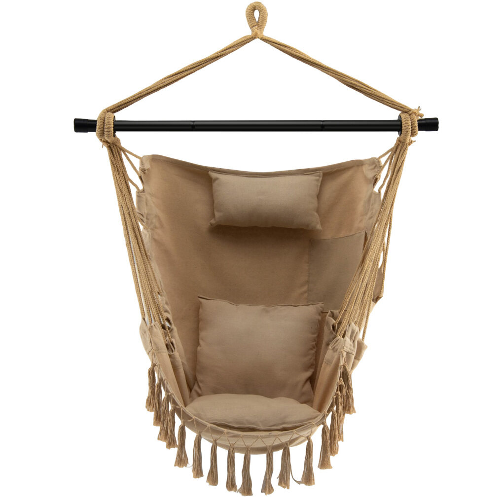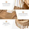 Enjoy your leisure time with this hanging rope swing chair! This comfortable hammock swing is made of durable cotton ropes and heavy-duty steel bars for long-term use. The grooved snap rings on each side of the bar ensure a safe and stable sitting experience. Besides, this hammock swing is paired with a soft pillow and 2 removable cushions for extra comfort. With elegant and stylish tassels, it will add charm to your indoor and outdoor places. The maximum weight capacity is 330 lbs. Requires easy assembly.