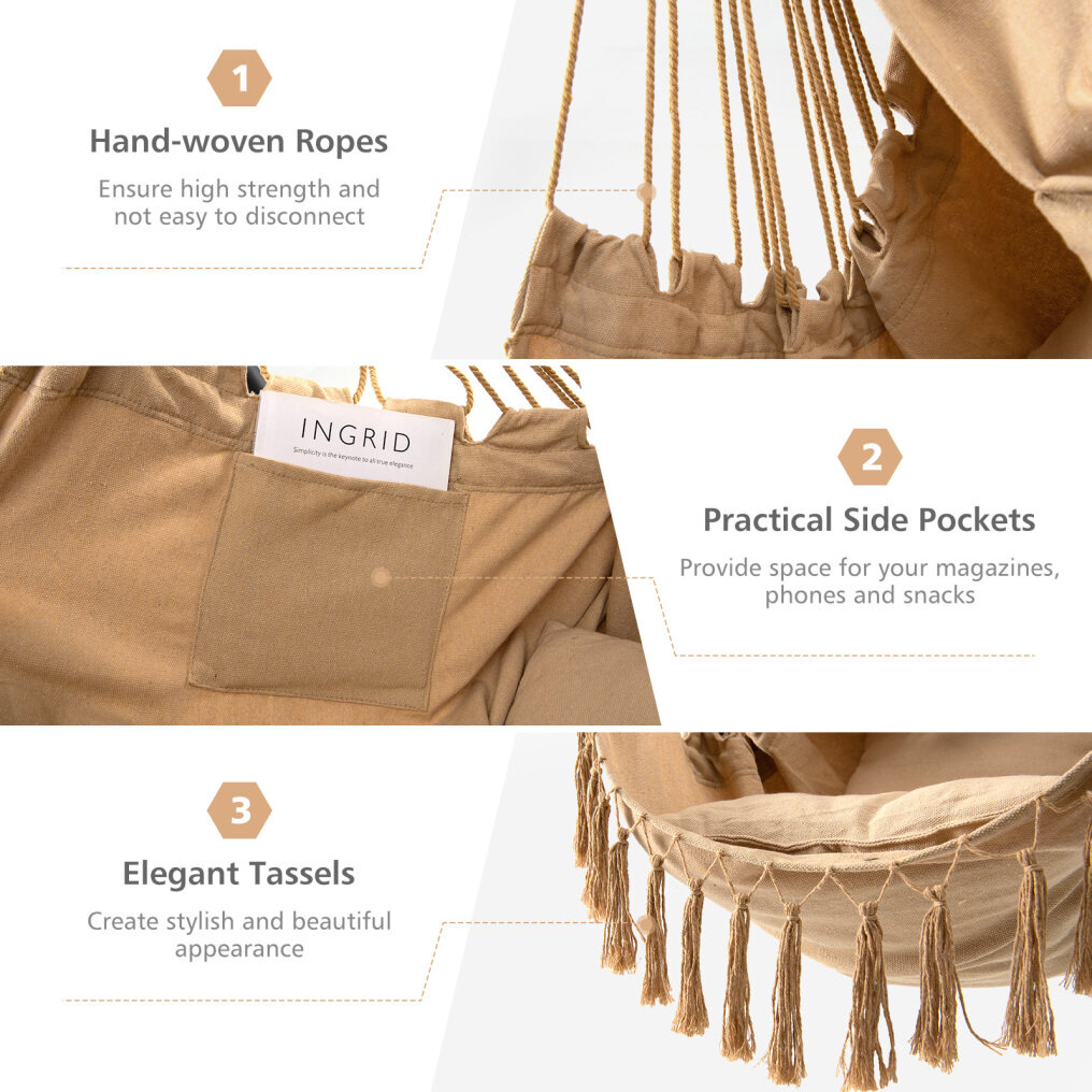 Comfy Seat with Side Pocket: This hammock chair is made of premium cotton canvas and hand-woven cotton ropes, which are skin-friendly and durable enough for long-lasting use. Besides, the large seat will let you enjoy full relaxation. And the convenient side pocket can hold your books or glasses.