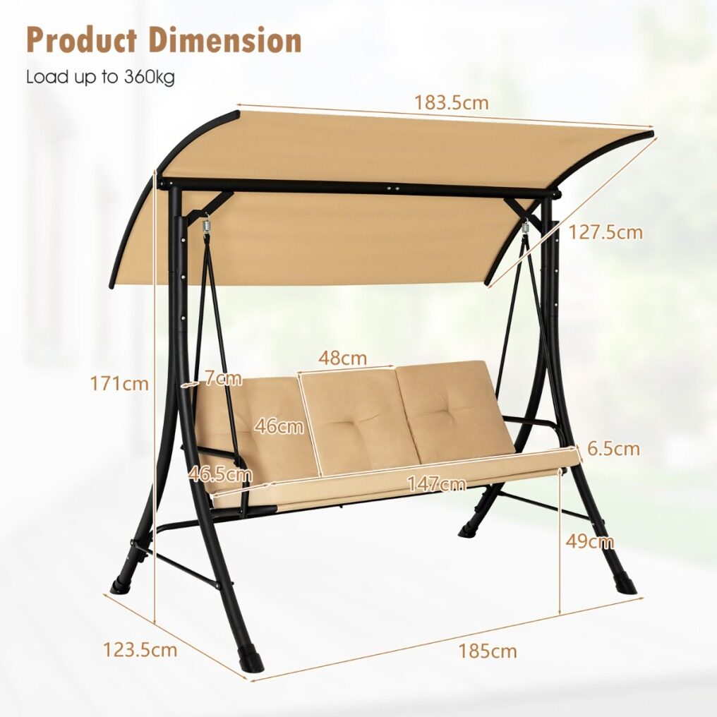 Adjustable canopy design maximizes the area of shade 130 cm wide sitting area is perfect for 3 people to sit