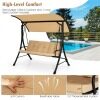 Our outdoor porch swing with a canopy can provide you with a comfortable sitting feeling, letting you have a good leisure time and relieve stress. The porch swing features heavy-duty steel frame, triangular base and solid springs hooks, bearing up to 362 kg. Seat fabric made of olefin is breathable and wearable for more comfort and longer service life. And the seat and back cushions filled with high-density sponge offer extra coziness. The top canopy which can be adjusted from 0-240° will effectively protect you from annoying sunlight on hot summer days. Moreover, non-slip footpads prevent the ground from scratches. All in all, this 3-person porch swing is your perfect choice for outdoor leisure and entertainment.