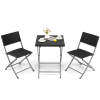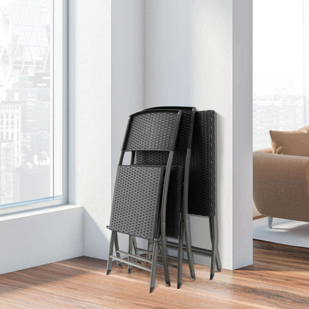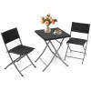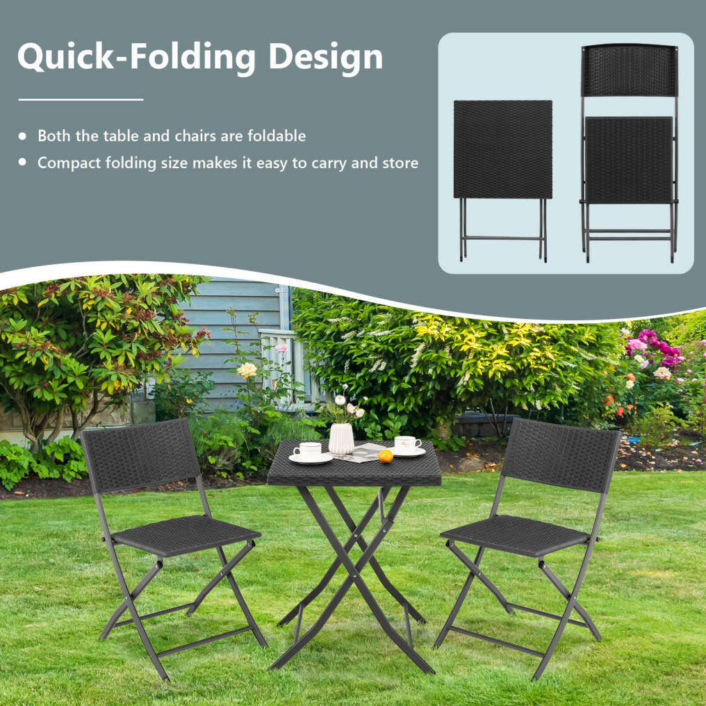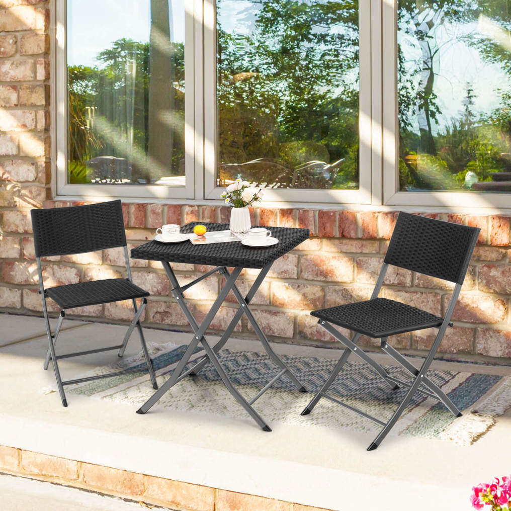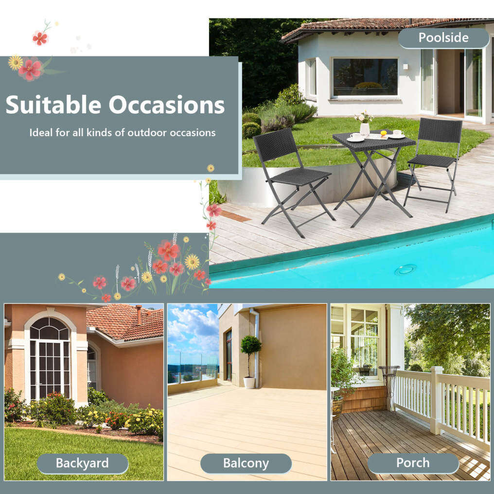 Spend a soothing and lazy afternoon with this 3-piece patio bistro set! The outdoor chair set features plastic-sprayed metal frame and stylish rattan, which can withstand long-time outdoor use. Including 2 chairs and a matching table, the patio set provides a perfect place for you to have a drink and enjoy the pleasure with your beloved one as well. Furthermore, folding design makes them space-saving and easy to carry and store. Plus, the chairs are ergonomically designed with breathable rattan, so that you can sit on the chair for a long time without any discomfort. All in all, this bistro set is the ideal choice for outdoor activities.
