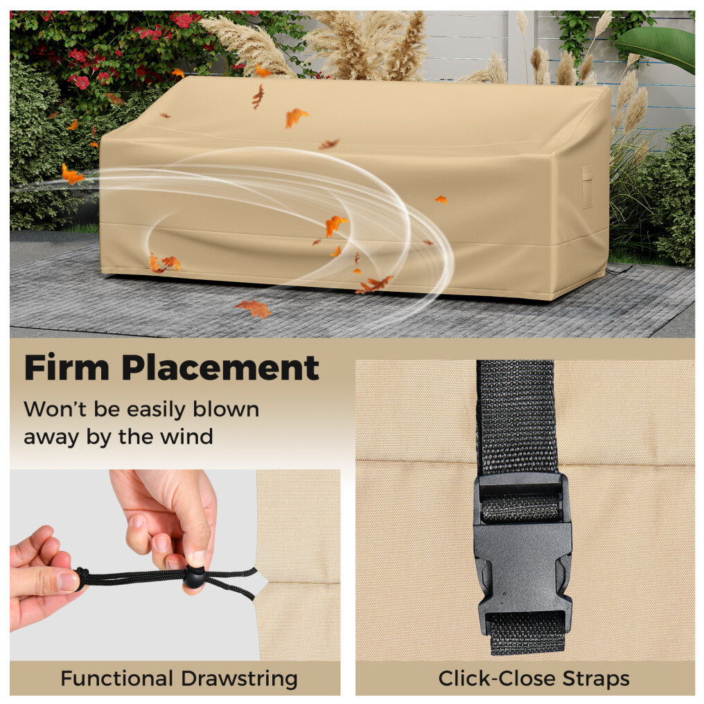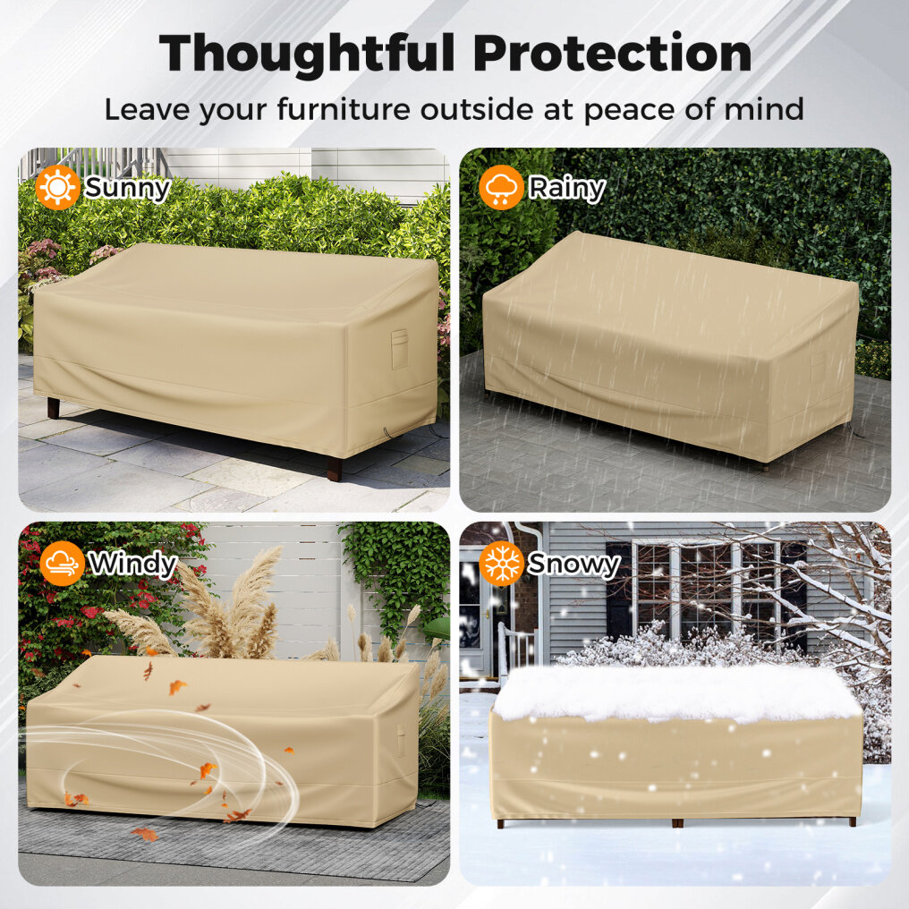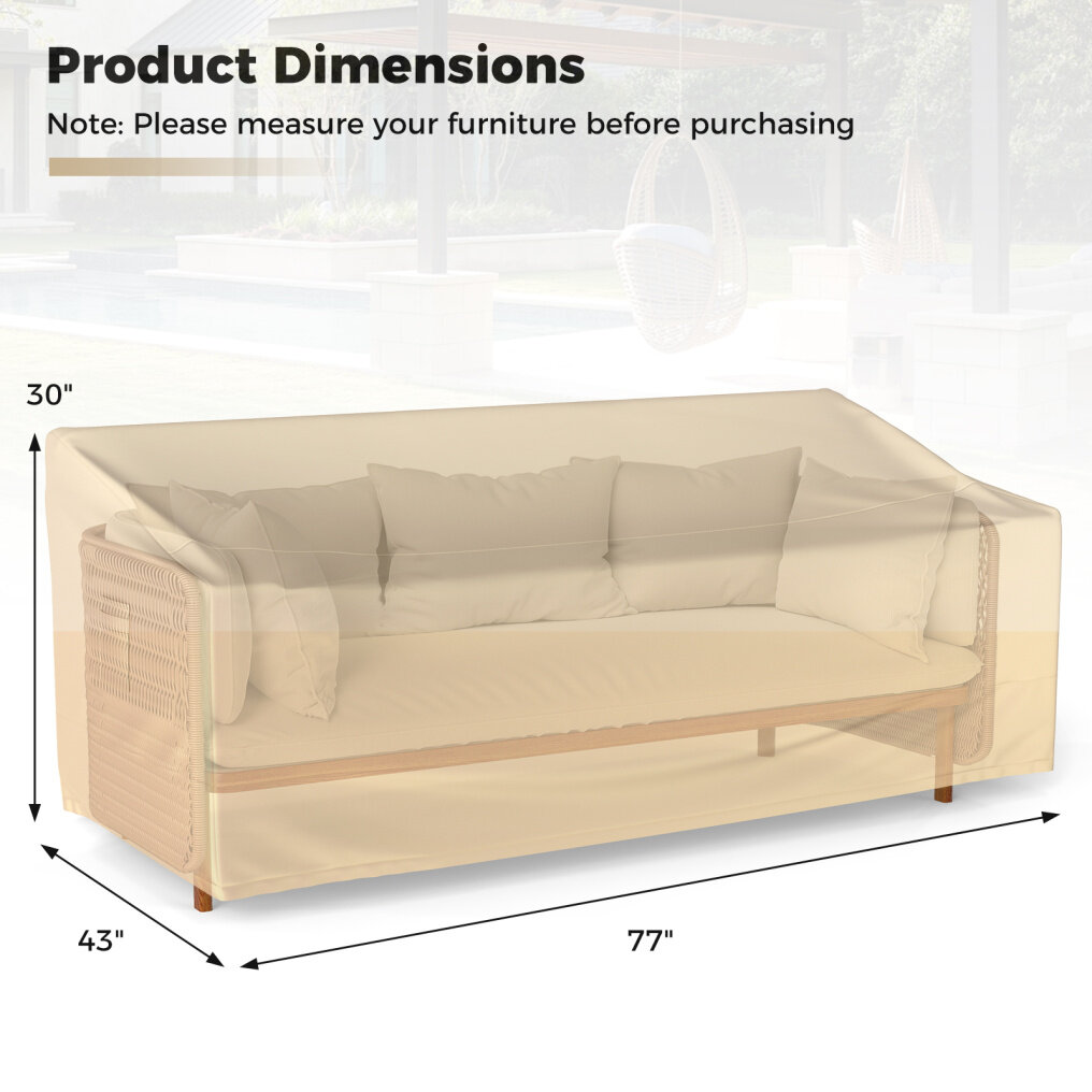 ● Appropriate Size: The size of this 2-seater patio sofa cover is 60" x 43" x 30"/77" x 43" x 30"/90" x 50" x 32", fitting a variety of sofas, loveseats, benches and couches. Please measure the size of your furniture carefully before purchasing. It is recommended that the product size is slightly larger than your outdoor furniture's.