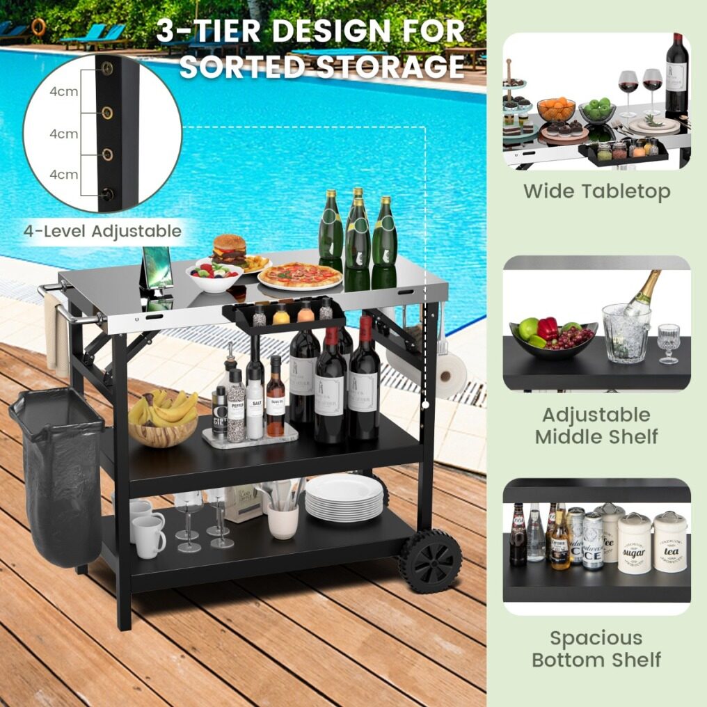 High-Quality Stainless Steel: Made of high-quality stainless steel, our outdoor cart has high strength and is perfect for long-time use. The stainless steel table top is water resistant, bringing the possibility of quick and easy cleaning. When BBQ sauce drips on the cart, you can easily finish cleaning it with a wet towel.