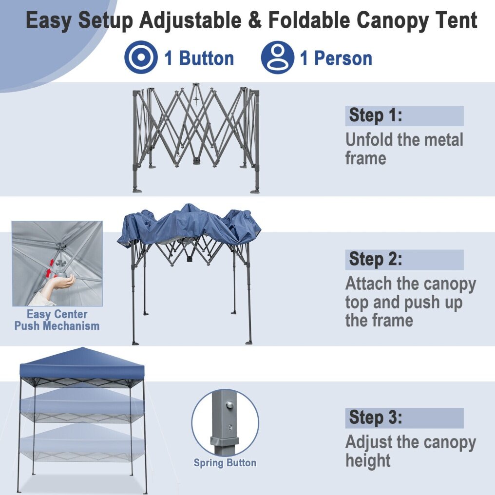 Adjustable for Multi-scenes: The folding canopy size covers a shaded area of 200 x 200 cm and is suitable for outdoor picnics, camping, parties, small business events, etc. In addition, with the spring buttons on the support legs, you can easily adjust 3 different height settings (190-245 cm) depending on the actual occasion.