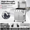 ● Exceptional Efficiency: This outdoor BBQ grill comes with 4 stainless steel burners and a side burner, which can generate 40000 BTU (10000 BTU each) cooking power totally to achieve high-to-low temperature control for succulent delicacy. And there exists a lid-mounted thermometer to keep track of the interior temperature. Besides, thanks to the flame tamers, the burners would distribute even heat.