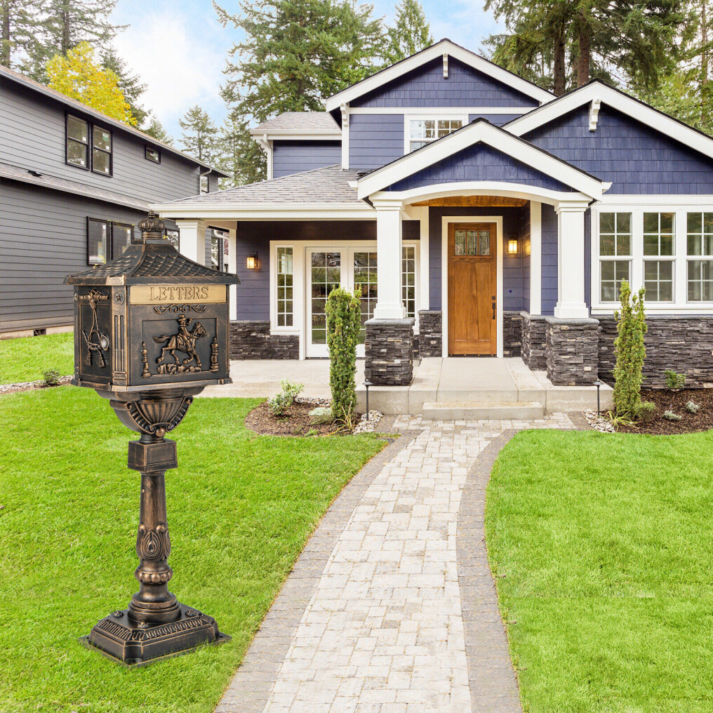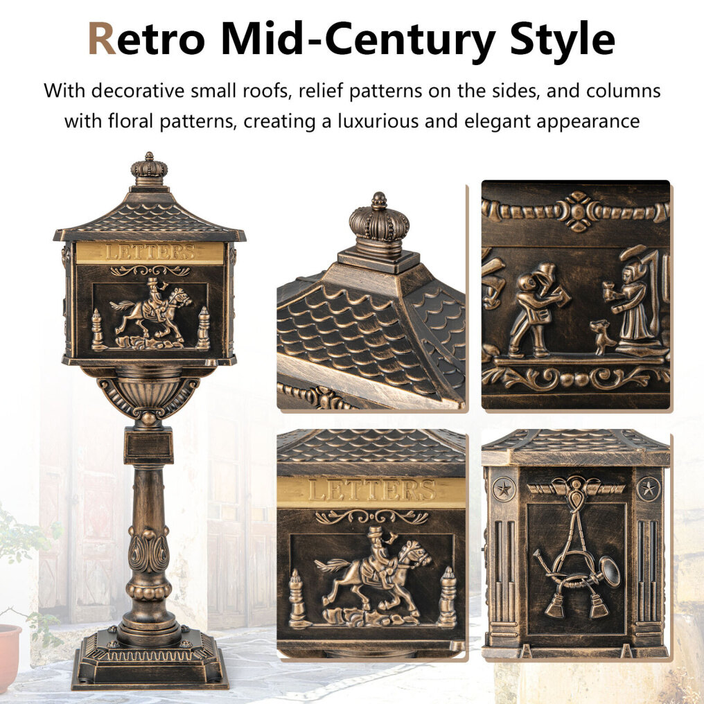 ● Retro Mid-Century Style: With decorative small roofs, relief patterns on the sides, and columns with floral patterns, the retro mid-century postal mailbox creates a luxurious and elegant appearance, which can be a charming scenery to your yard.
