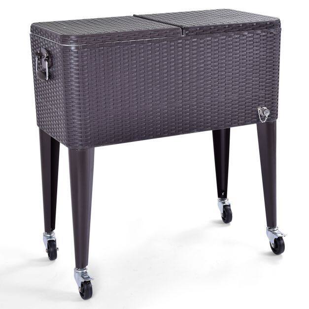 This is Our 76L PP Rattan cooler cart and it will add beauty, style and functionality to your patio. This cooler cart features refrigeration insulation and perfectly enables to keep a variety of drinks, such as water, wine, beer, vintage juicy and other for 36 hours. For convenience, this cooler is humanized designed and comes with a bottle opener and a cap catcher as well as a drainage plug for easy daily use and care; furthermore, it is equipped with two side handles for carry or pull, and the special designed dual top lids for easily opening and closing.