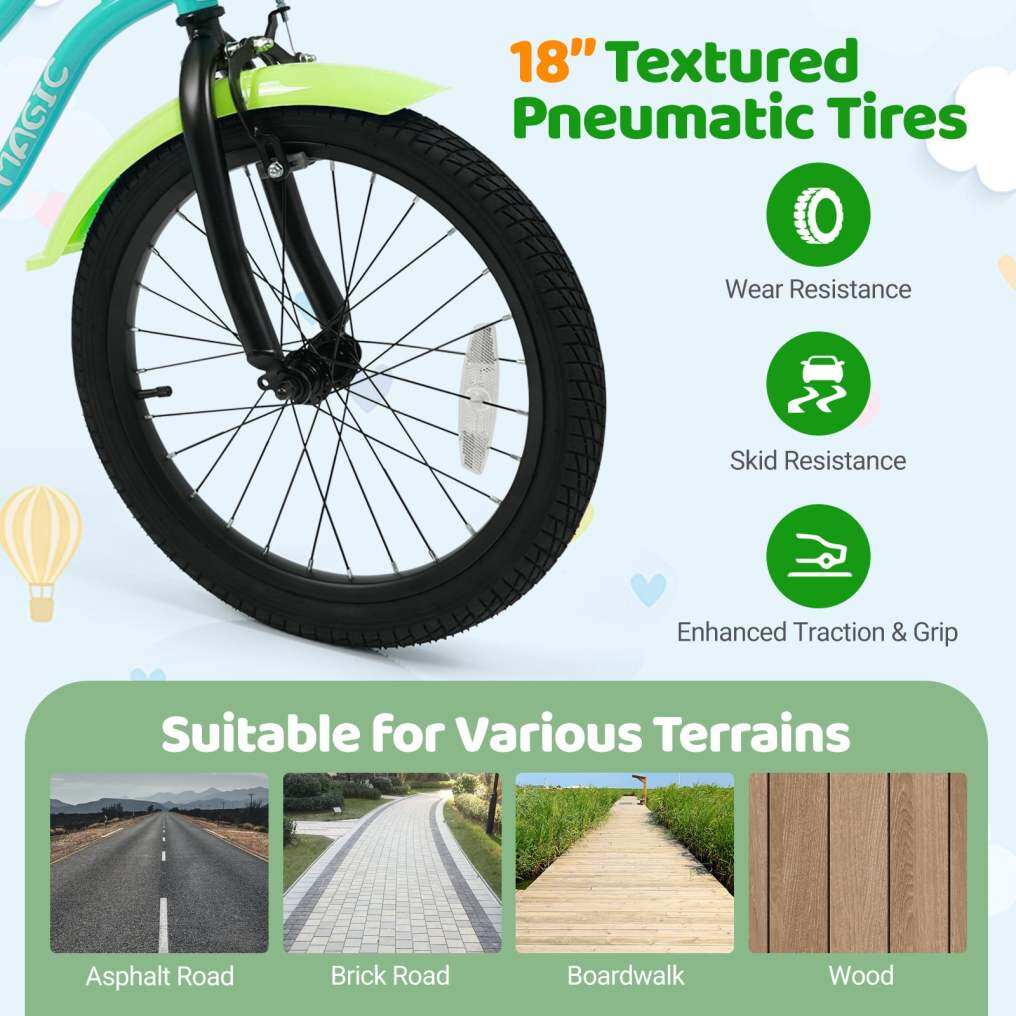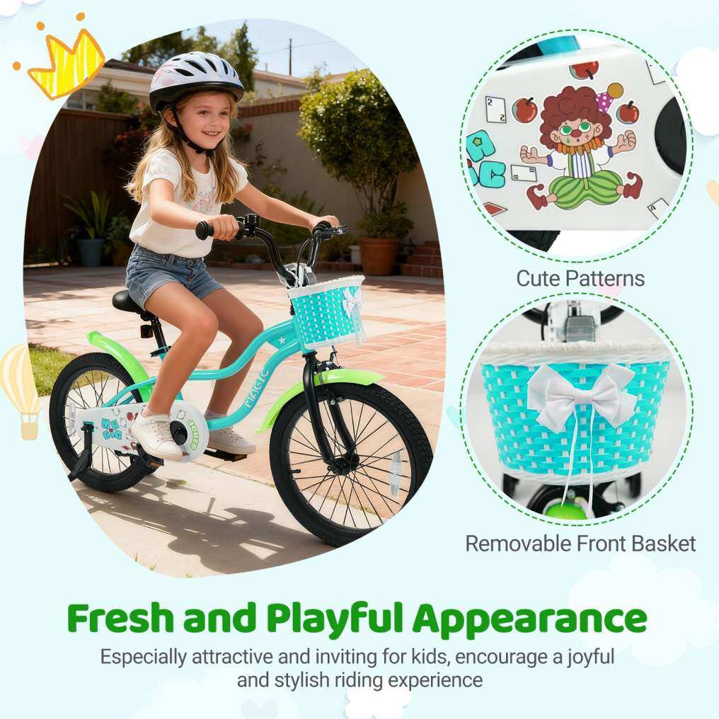 ● Thoughtful & Kid-Friendly Extras: This children bicycle comes alive with vivid, cute patterns, offering a fresh and playful appearance. Your child will love the removable front basket for storing treasures, while the convenient bell, comfortable seat, mudguard, and reflectors add both convenience and safety. Plus, the sturdy kickstand on the 18” bike is perfect for independent parking after each ride.