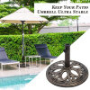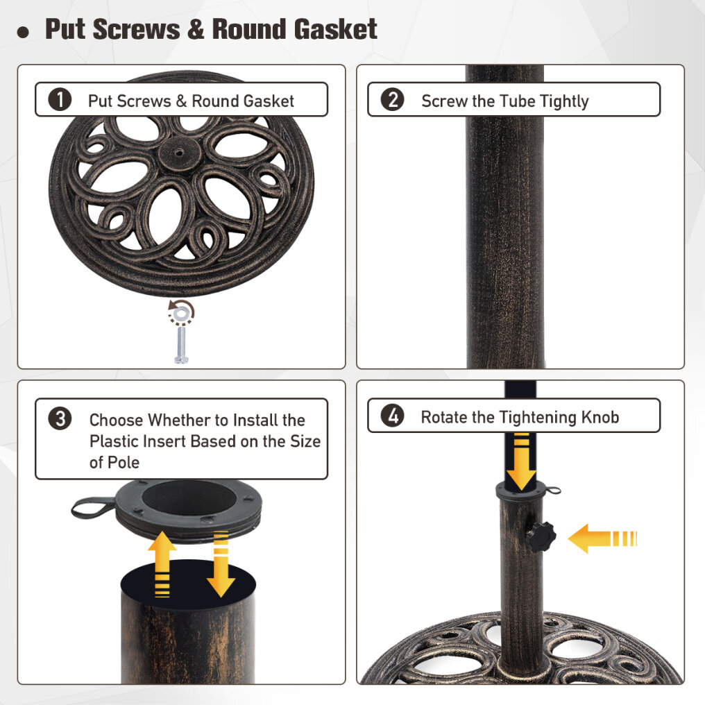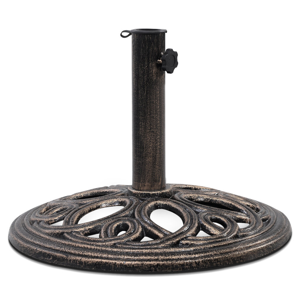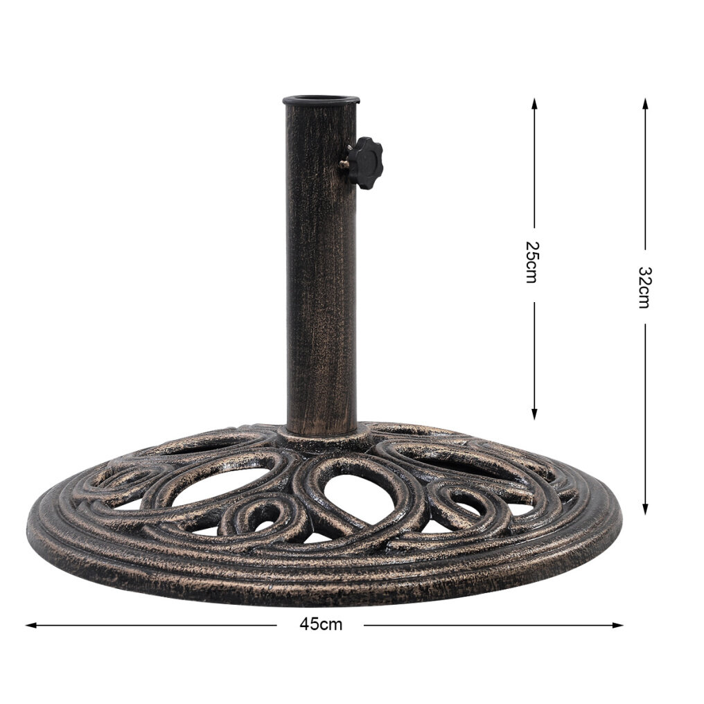 It is made of premium cast iron content that can withstand the sun and wind and last for many years. It has a circular base that allows it to bear a patio umbrella with excellent stability. Its elegant style, which features a petal-like pattern and a classic bronze color, makes it an ideal complement for all types of patio umbrellas. It's worth noting that the pole adapter can be mounted or relocated to fit 38 mm and 48 mm diameter columns, respectively. Installation is also simple, thanks to the structure's simplicity. It is an excellent option for residential or commercial use, from the backyard to the patio, from the poolside to the outdoor café.