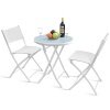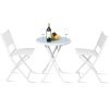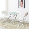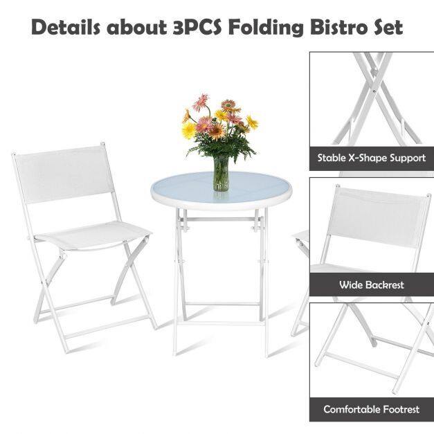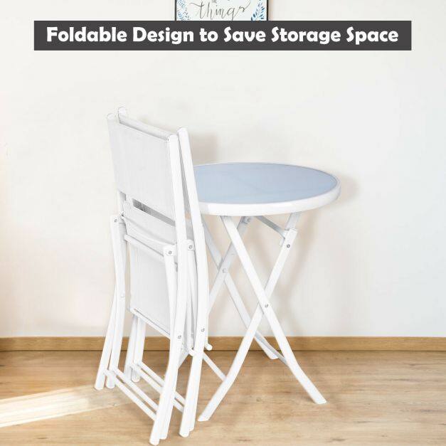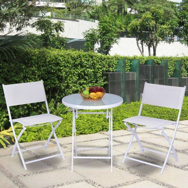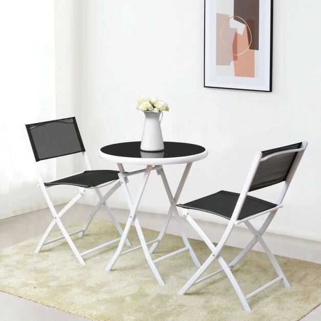 It includes two folding chairs and one folding coffee table with black tempered glass. The seat and the backrest are made of textile fiber. The frame of the chairs and table are made out of metal tubular and it is exceptionally sturdy .It enjoyable to have breakfast or afternoon tea in the garden or other outside space with this comfortable and attractive Patio Set which features a simple design. It will be your excellent choice to buy. Don't hesitate to buy it now!