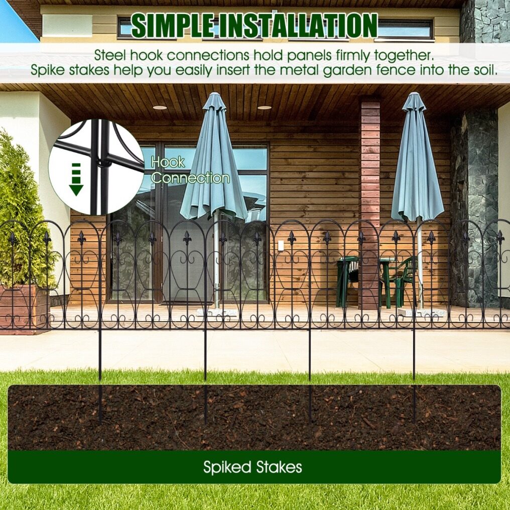 Made of rust-resistant and sturdy metal that features weather-resistant, waterproof, durable for long term use. Panel side rings allow you to easily interlock the panels, then simply stick and secure the fence leg directly into ground. This moveable garden fence can fold flat for easy storage and is ideal for transporting. This metal fence comes in a simple yet tasteful style which adds elegance to your garden or walkway. It helps to define and protect your garden, paths and landscapes. A great option to make a landscape border around a tree, a plant bed, lawn and also a barrier for dogs and animals.